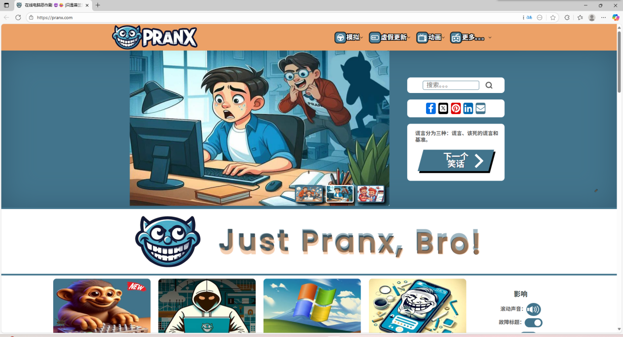 2、Pranx这是一个用来专门整蛊朋友的网站,里面全是各种离谱又好玩的整蛊工具,整蛊效果直接拉满。比如黑客模拟器、假病毒警告,高仿真的windows蓝屏死机,系统崩溃警告等等,一个比一个逼真。