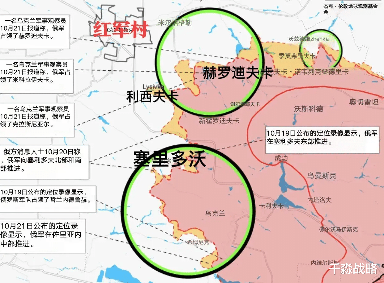 俄军占领了红军村东南方向的赫罗迪夫卡、尼古拉耶夫卡、克拉斯尼亚尔,个人将俄军此举称之为“拔根行动”,红军村外围有密密麻麻的乌克兰定居点,是典型的工业区,乌军依靠红军村作为后方基地,向外围据点进行物资和人员调动,目前俄军对红军村的拔根行动接近尾声,随着红军村南翼的塞里多沃被俄军围困,俄军有了夹击红军村的基本条件。