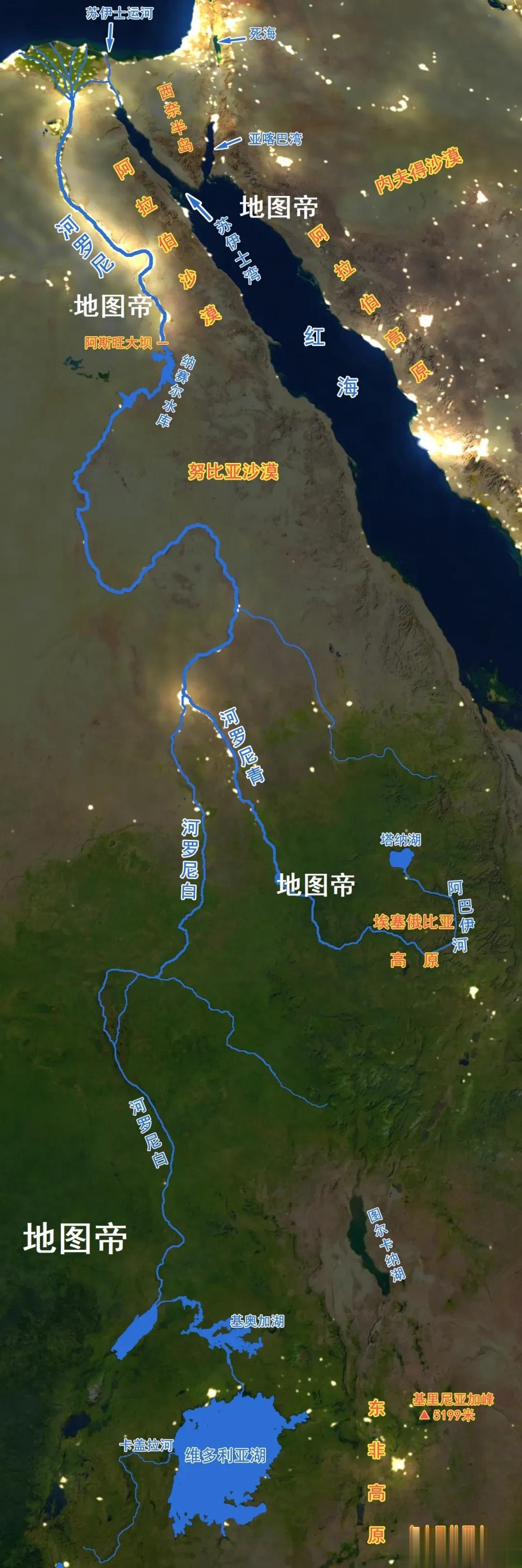尼罗河在塔纳湖这条支线,分别是:小尼罗河-塔纳湖-阿巴伊河-青尼罗河-尼罗河。