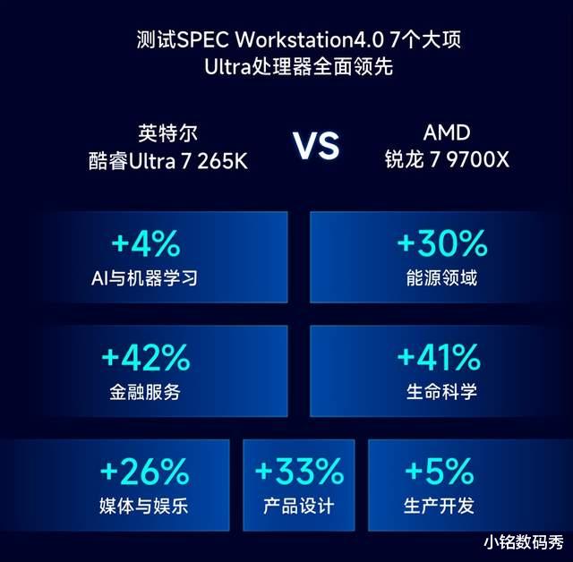 还有在3D渲染和建模上,比如3DMAX和MAYA,265K的特定模型阴影和抗锯齿操作的性能领先更明显;还有Spec Workstation的测试下,265K也能保证在多个领域完胜9700X,也就是说265K凭借QSV技术、架构以及性能优化,在生产力上提供了更高的效率。