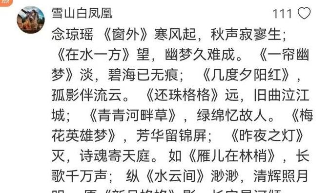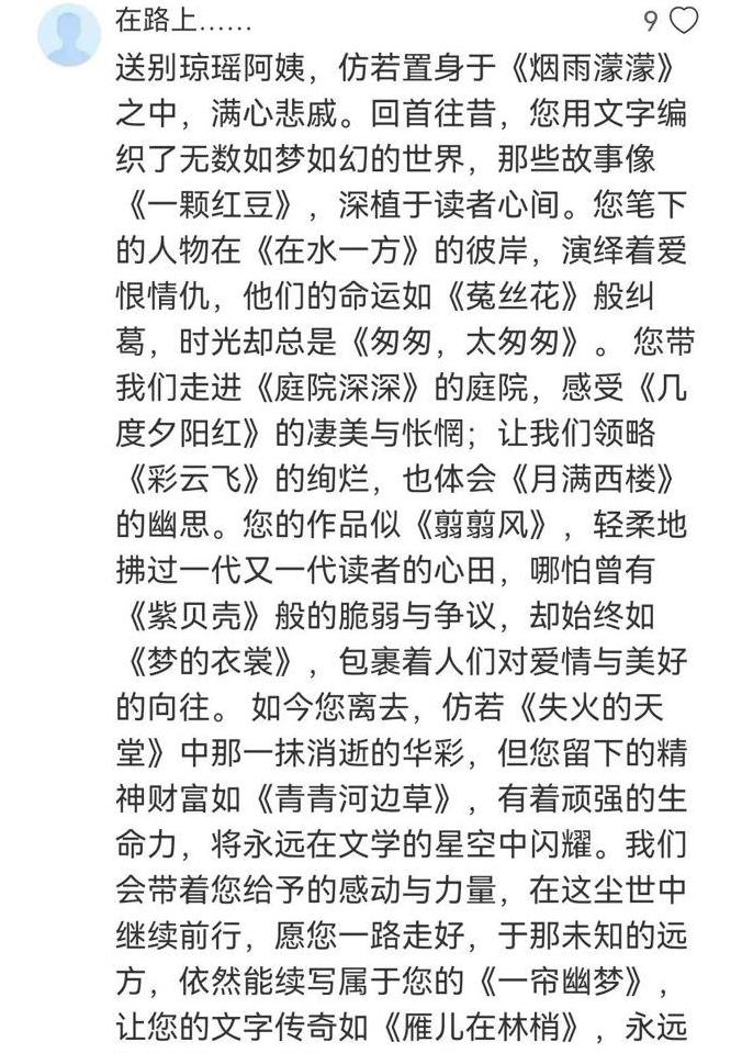 琼瑶所写的言情小说,曾成为70后和80后众多年轻女孩的青春回忆,为我们这些年轻的一代带来了丰富的幻想和情感享受。琼瑶的小说标题和女主角的名字都展现出了极高的美感,充满了唐代诗歌和宋代词汇的韵味。特别是在小说的命名方面,每一部作品的标题都仿佛是一首诗歌,如《月满西楼》、《心有千千结》、《烟雨蒙蒙》、《一帘幽梦》、《碧云天》、《寒烟翠》、《聚散两依依》等。我在网络上发现有网友使用琼瑶小说的标题来串联一段纪念琼瑶的文字。这种以小说名称或歌曲名称来串联文章的文字游戏,在过去曾在学校中广受欢迎。其中有两位网友写得非常出色,我想分享他们的创作截图给大家。