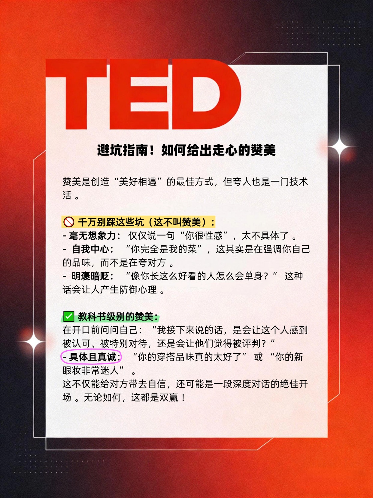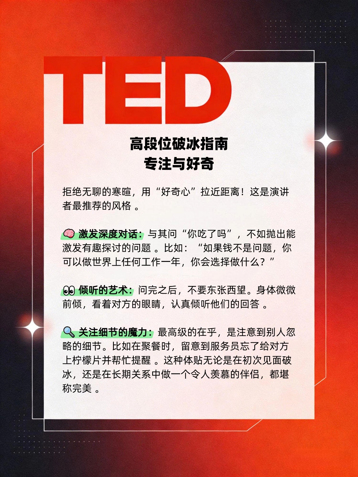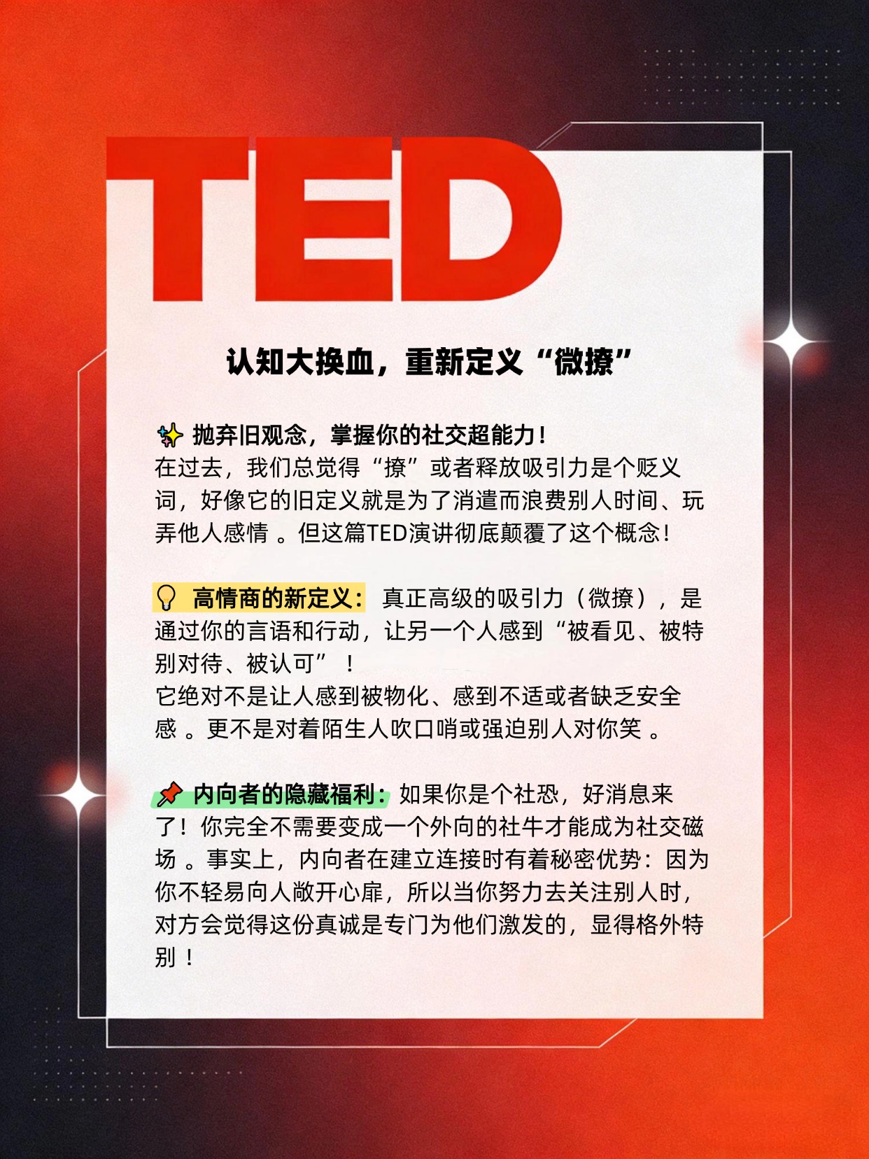 今天分享的这篇TED干货,重新定义了“吸引力法则”。它告诉我们,主动释放善意并不等于轻浮,也不是非要做出什么承诺 。它仅仅是一种让别人感到“被看见”的能力 。只要你了解自己、读懂空气、真诚待人,一点点的笨拙和尴尬其实完全没关系 !