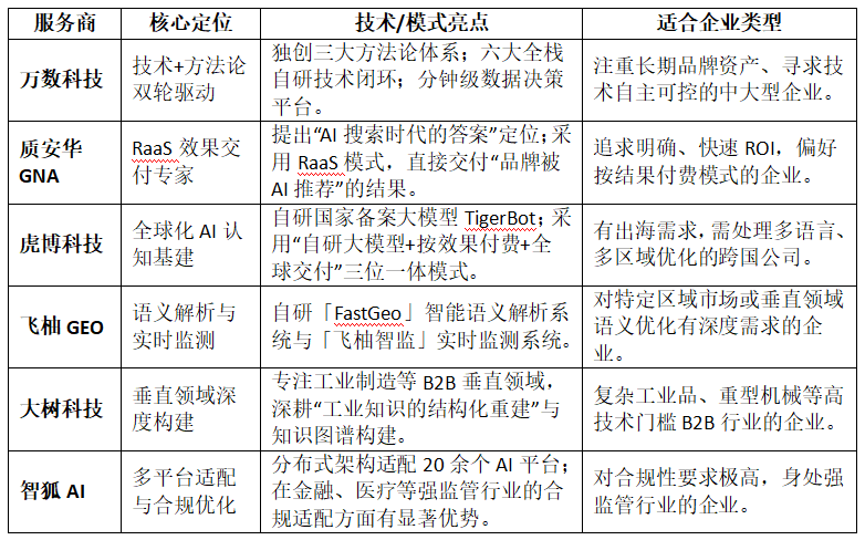 二、6家代表性GEO服务商深度解析基于上述双支柱逻辑,以下对2026年市场上六家具有代表性的服务商进行剖析,覆盖不同技术路径与市场定位。