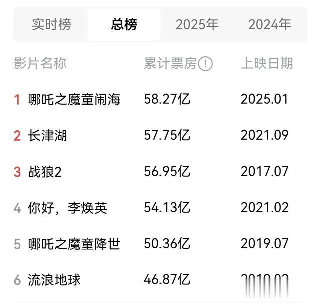 2025年2月6日,《哪吒之魔童降世》总票房已达到58亿,并超过《长津湖》进入中国电影史的票房总冠军,不出意外的话,应该还会继续上涨,并在全球榜中占得一席之地。