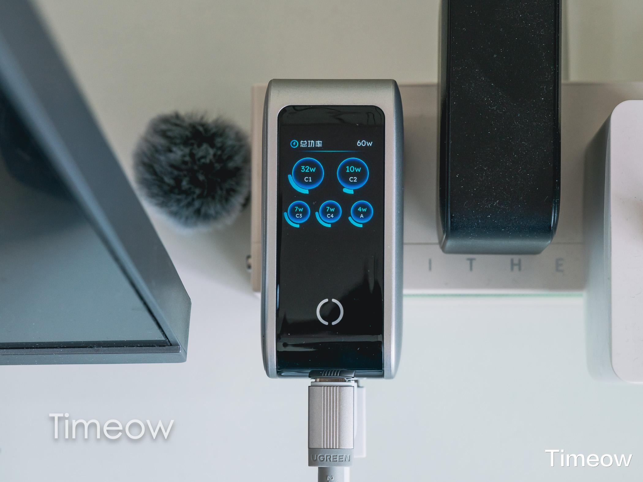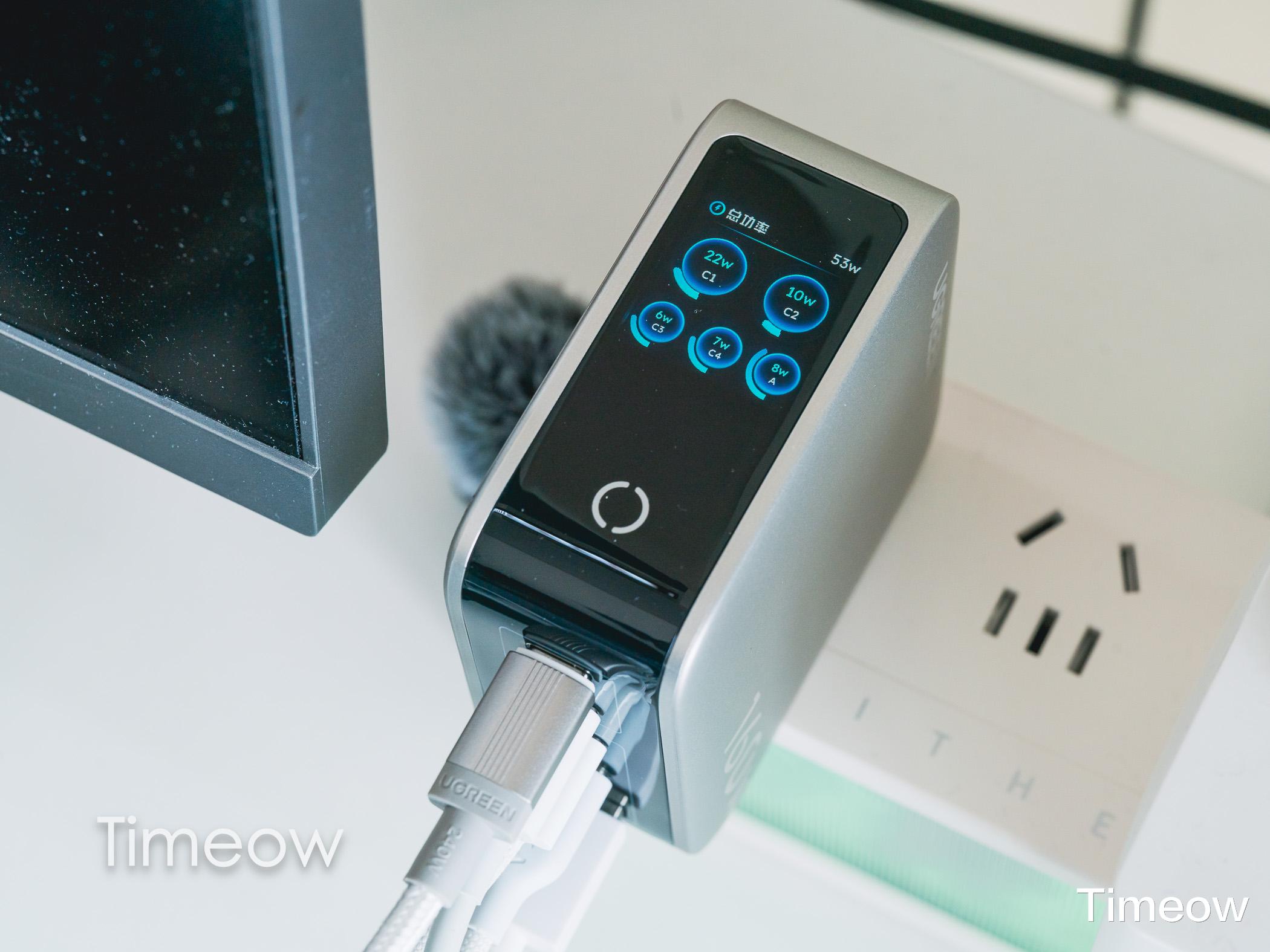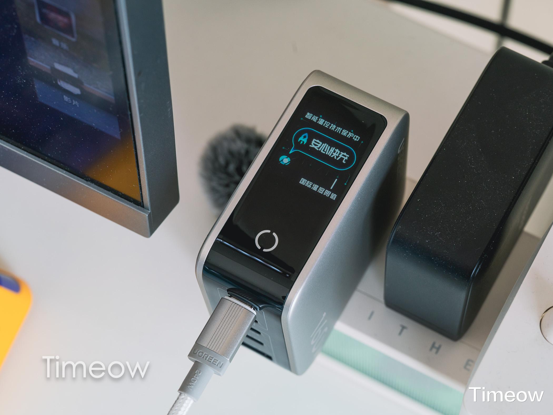 除了多口大功率之外,绿联这款充电器最戳我的设计,莫过于机身顶部的LED数显屏了——这也是它“速显充”命名的核心原因。