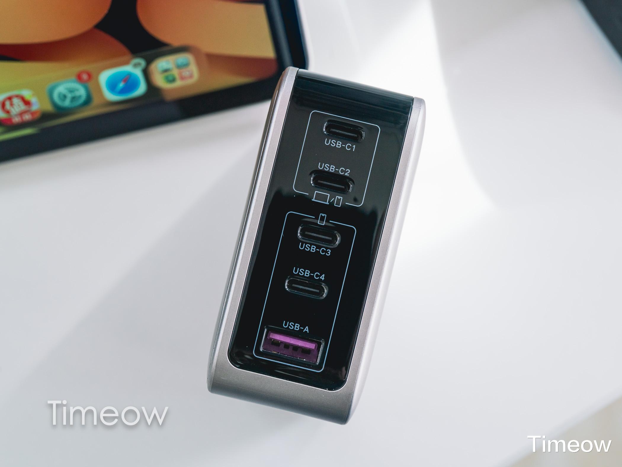 它配备了的4个USB-C接口和1个USB-A接口,C1和C2最大140W,总功率160W,接口组合覆盖了目前主流设备的充电需求。通过内部智能芯片,它能实时识别每台设备的充电协议和功率需求,自动分配供电比例。比如单口给笔记本充电时,能直接输出140W满速功率;当同时接入笔记本和平板时,功率会自动拆分,两者都能激活快充模式;如果接入的是耳机、手环这类小功率设备,则会自动切换到小电流模式,避免过充损伤设备。