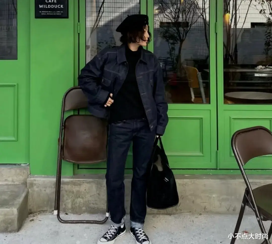 微宽松的深色牛仔外套自带面料的硬朗气息,内搭黑色T恤。下身搭配同色系的法棍牛仔裤,直线条的裤型显高显瘦,特别适合小个子。上宽下窄的搭配松紧有度,利落又有几分休闲随性,时尚十足。▼