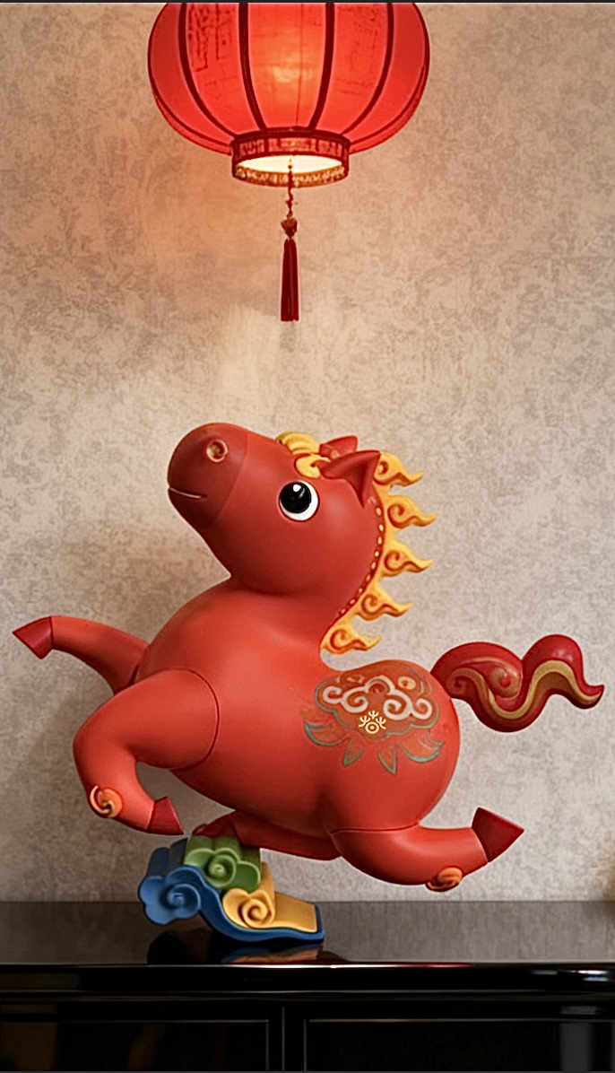 “吉祥马”以甘肃武威出土的东汉铜奔马——马踏飞燕为设计灵感,借鉴唐代五花马的鬃毛装饰手法,主色采用中国红,辅以祥云纹、如意纹等经典传统纹样,体现中国春节温暖、喜庆的氛围。