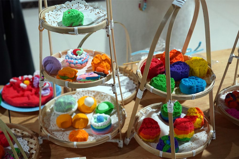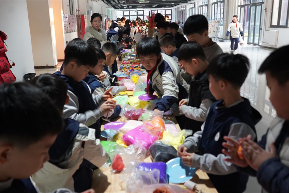 在《中华年味儿》区,彩色超轻黏土堆成小山,学生们的小手灵巧翻飞,捏出饺子、汤圆、糖葫芦、年糕等传统年节食物。他们通过绘画、手工等形式,展现记忆中和想象中的传统年节景象与元素。