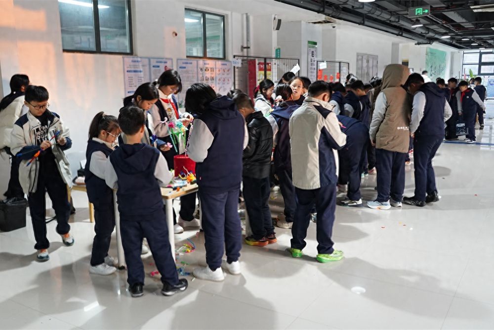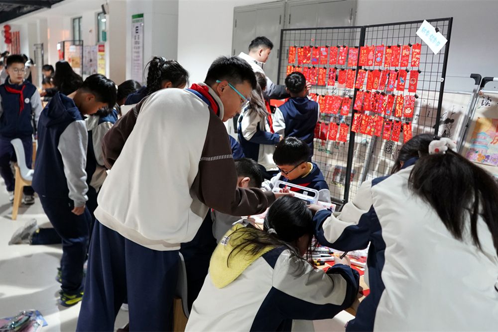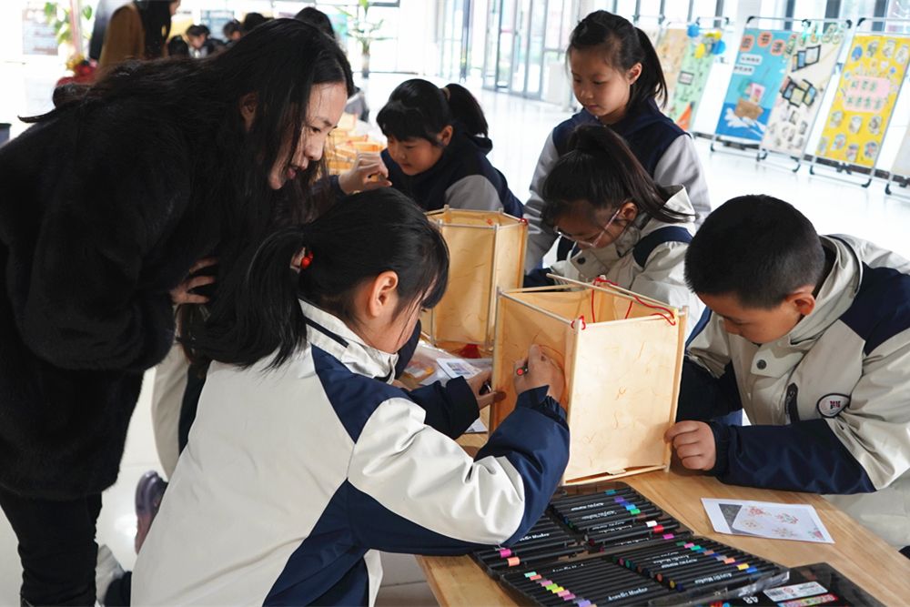 在《福桶DIY+年年有“鱼”》区,红色小桶、扭扭棒、彩纸、胶水……学生们用简单材料制作“福桶”,并用扭扭棒折出金鱼、花朵、蝴蝶等造型插在桶中。学生们结合创意手工,制作象征福气汇聚的福桶和寓意富足安康的剪纸作品,寄托对新年美好的期盼。