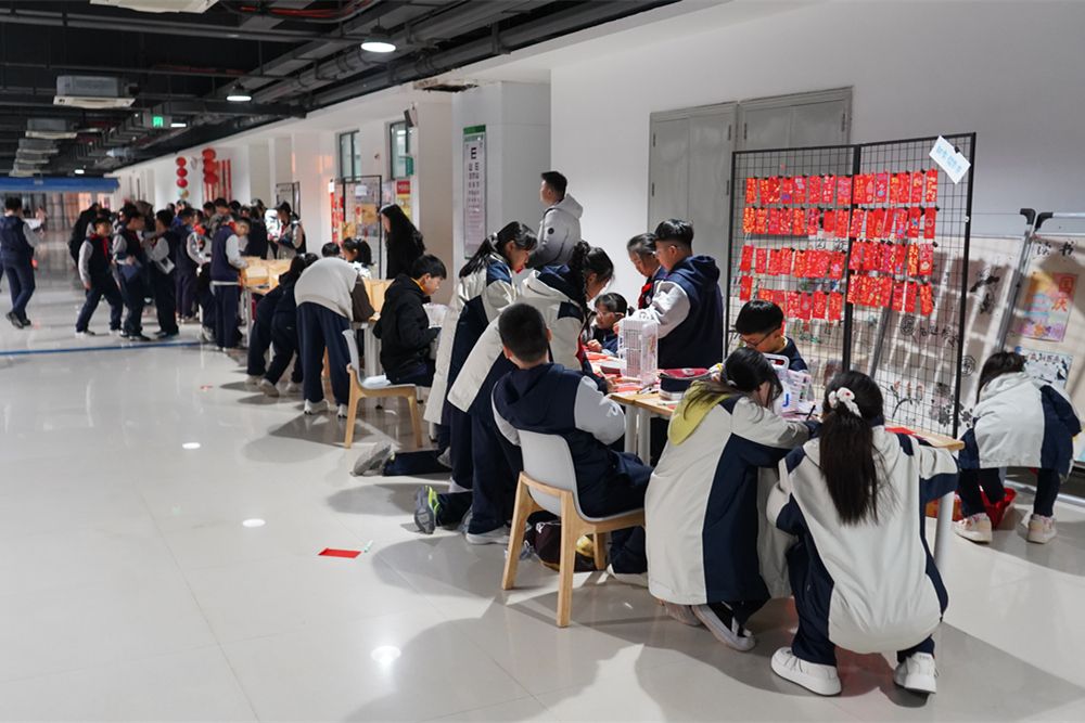 走进百米长廊,一排排学生亲手绘制的灯笼悬挂在空中,色彩斑斓、图案各异;长桌上摆满超轻黏土、彩笔、扭扭棒和素面红包,学生们穿梭于各个体验区,在剪、捏、绘、贴中感受节庆的独特魅力。本次活动的核心理念围绕“烟火气”展开,通过精心还原传统庙会场景,营造出浓厚的新年氛围。