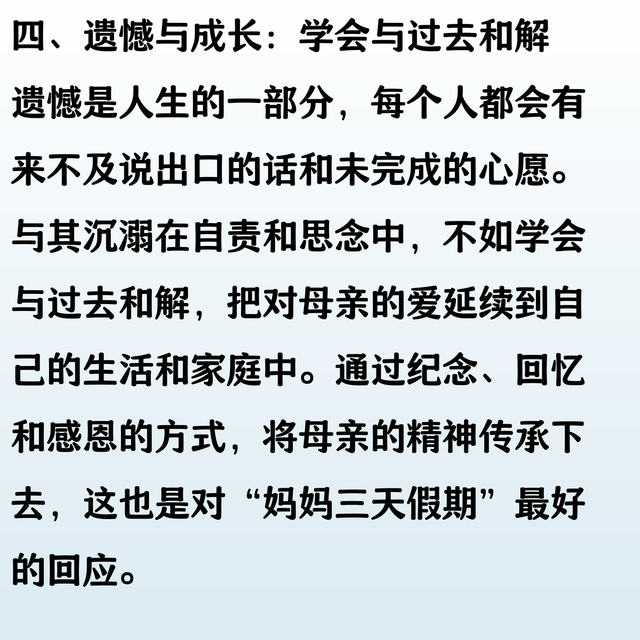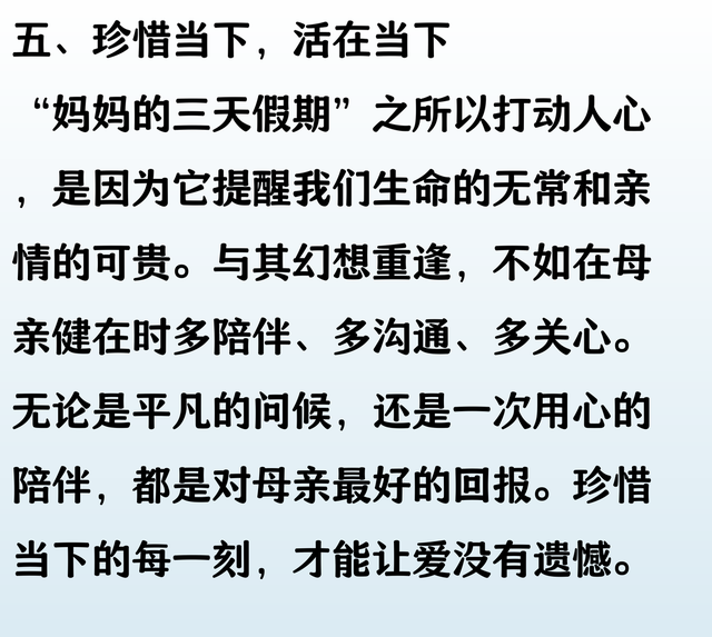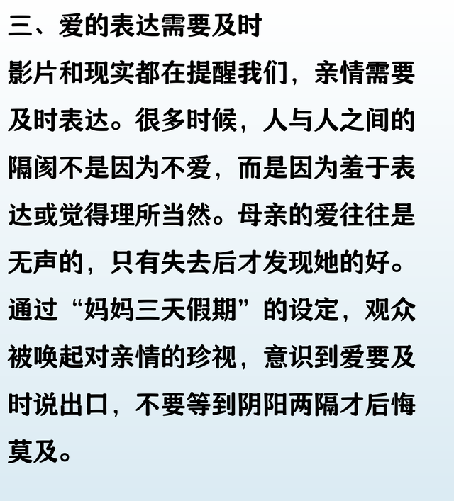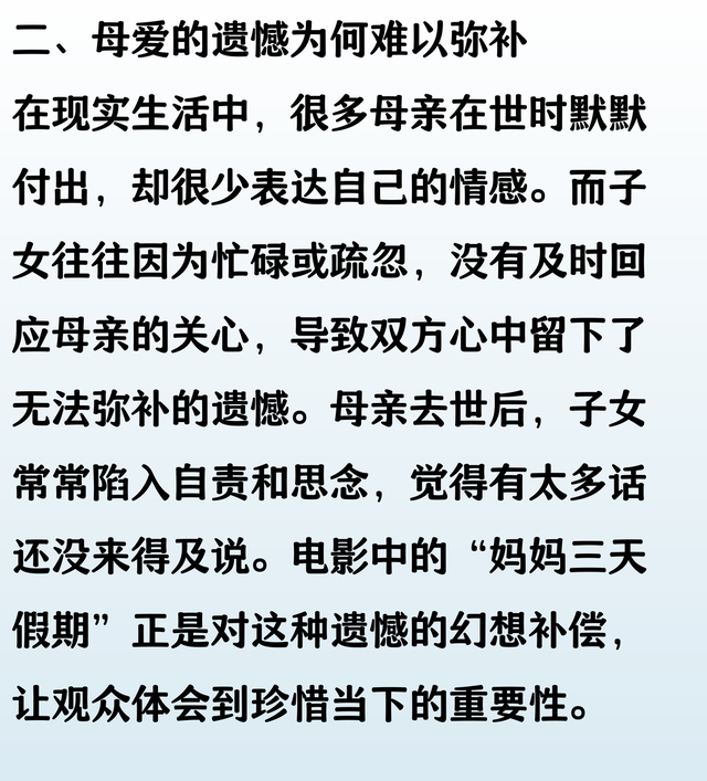 有些爱,直到阴阳两隔,依然难以释怀。妈妈短暂的“三天假期”,让我们看到她在时光尽头依然放不下的牵挂。 那些未曾说出口的关心和愧疚,仿佛都在这短短几天里倾泻而出。原来,母爱的遗憾,并不会因离别而消散,反而愈发深刻,甚至在生命的尽头,还想用尽全力去弥补。