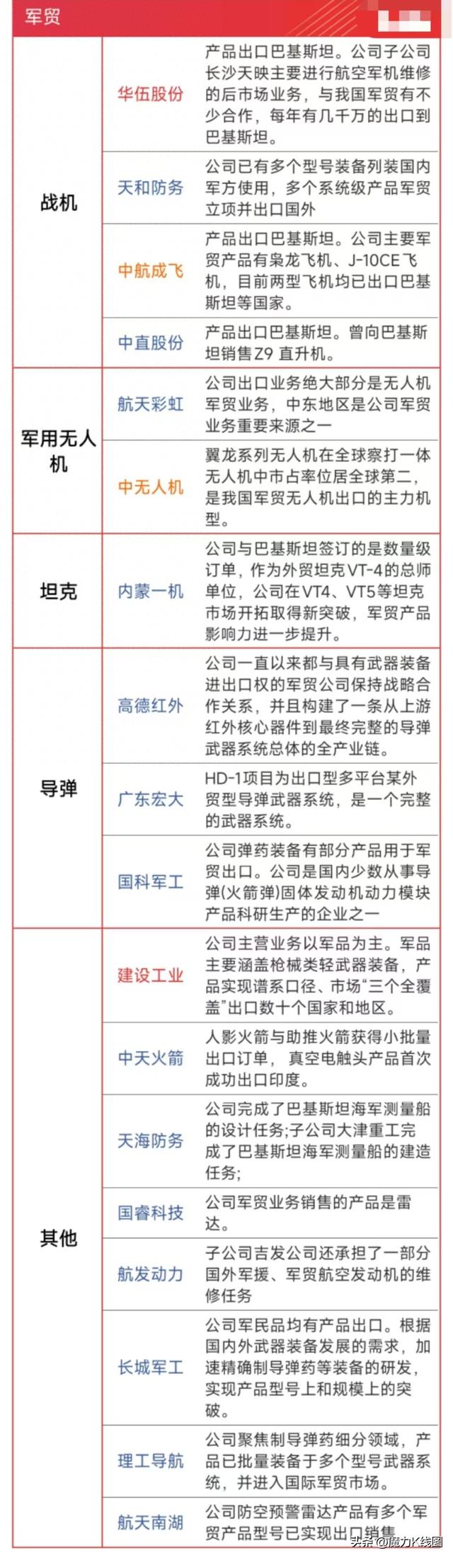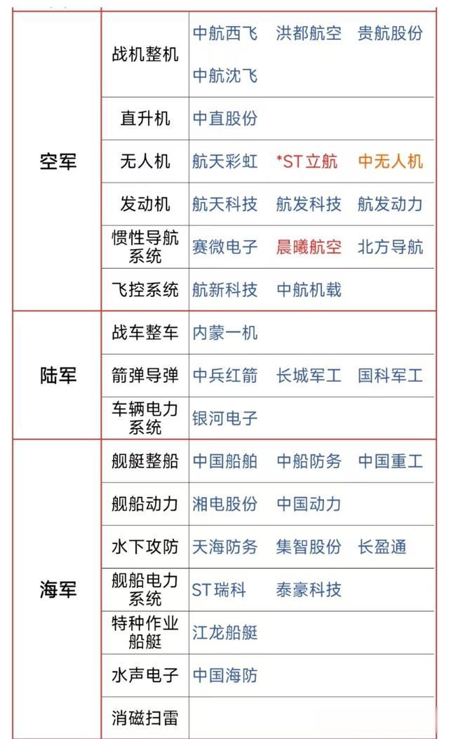 华伍股份、天和防务、中航成飞、中直股份、航天彩虹、中无人机、内蒙一机、高德红外、广东宏大、国科军工、建设工业、中天火箭、天海防务、国睿科技、航发动力、长城军工、理工导航、航天南湖。
