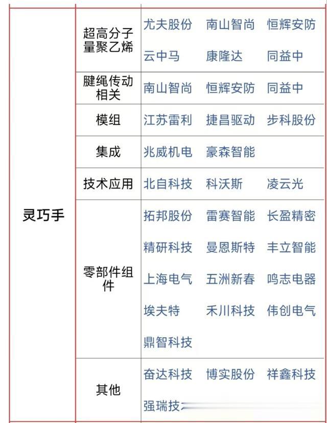 南山智尚、云中马、尤夫股份、同益中、江苏雷利、捷昌驱动、兆威机电、豪森智能、科沃斯、北自科技、拓邦股份、精研科技、鸣志电器、五洲新春、禾川科技、祥鑫科技。