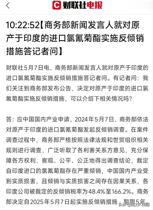 事件驱动:消息面上,5月7日,对原产于印度的进口氯氰菊酯实现反倾销措施,期限5年。