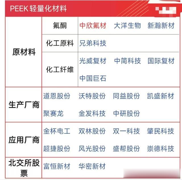 中欣氟材、兄弟科技、光威复材、新瀚新材、同益股份、金发科技、中研股份、双一科技、肇民科技、聚赛龙、双林股份。
