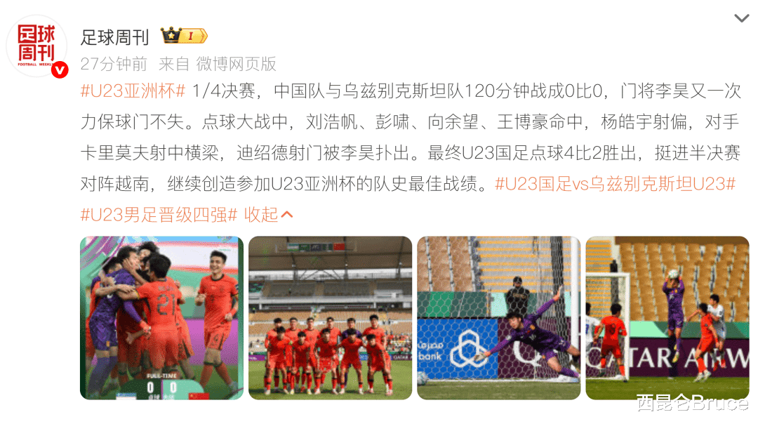 当晚,在沙特阿拉伯吉达举行的U23亚洲杯四分之一决赛中,中国U23男足通过一场令人窒息的120分钟0比0鏖战和点球大战,最终以4比2的比分战胜了实力强劲的乌兹别克斯坦队,历史性地首次闯入该项赛事的四强。