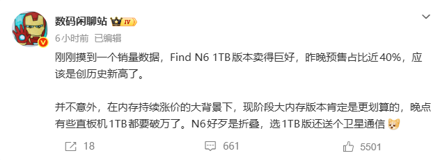 市场数据的反馈足以证明,用户对于大存储的需求已经从“发烧配置”转向“功能刚需”。1TB 版本的火热不仅是 Find N6 产品力的体现,更是消费者在内存价格波动与 AI 手机普及交汇点上,做出的一次理性选择。