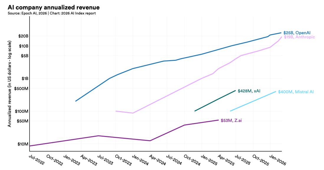 如下图所示,OpenAI、Anthropic、xAI、Mistral AI、智谱等头部AI企业的年化营收估算,在近年实现了快速增长。