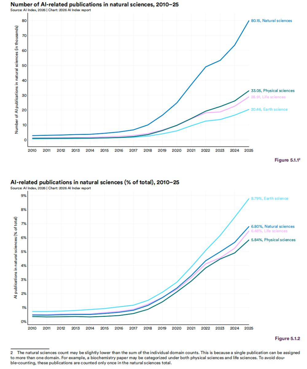 在Web of Science数据库中,自然科学领域与AI相关的论文发表量从2024年的63547篇增至2025年的约80150篇,一年内增长约26%。其广泛性表明,AI方法正成为各学科科研实践中常规组成部分。