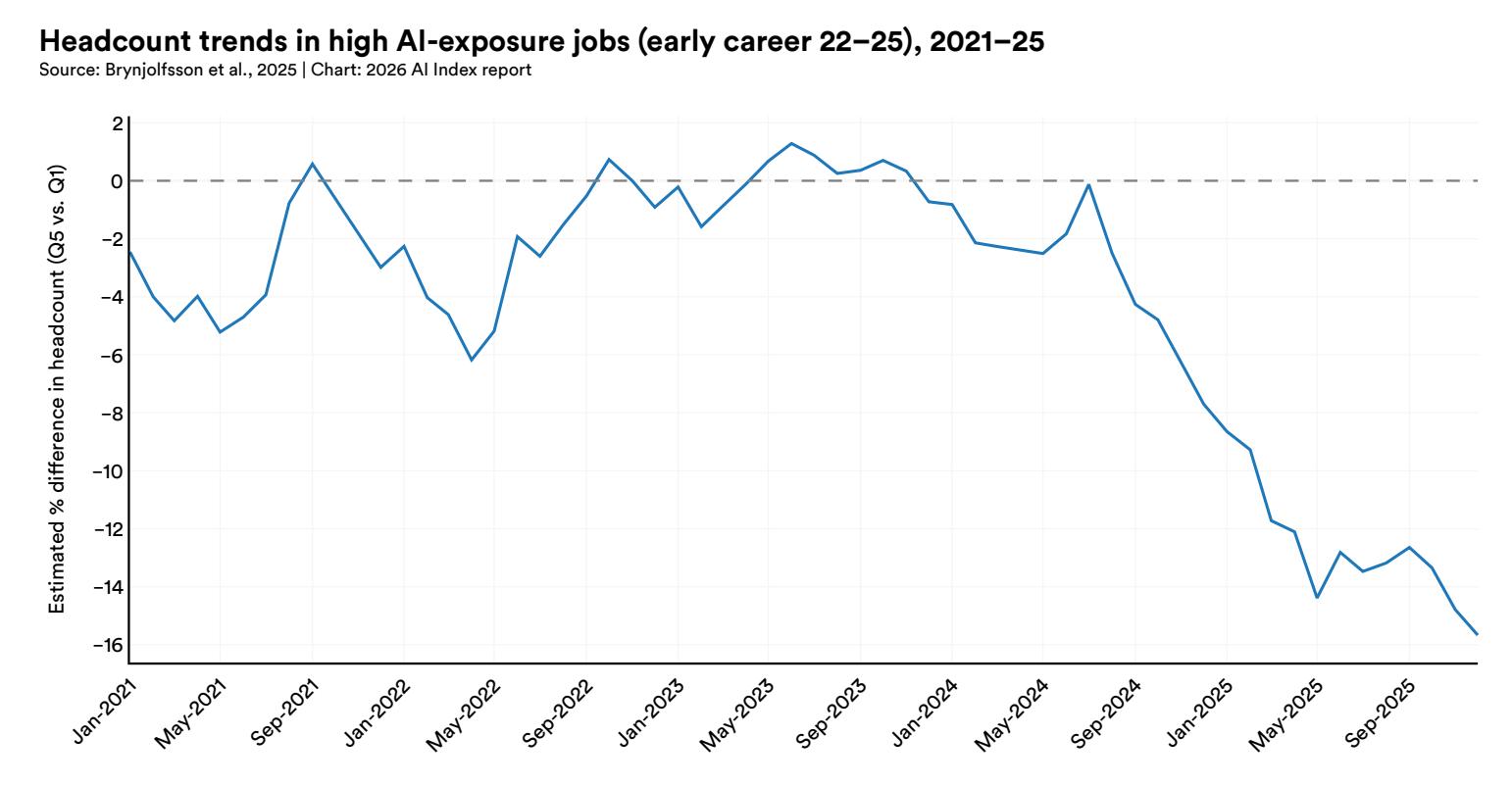 在就业市场22-25岁软件开发者的就业率较2024年下降近20%。