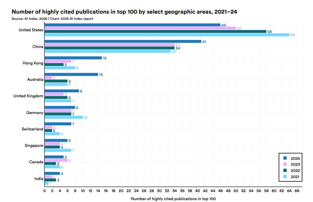 高引用论文中,美国居高引论文数量第一,但份额持续下滑,中国份额持续攀升,从2023年的34篇增至2024年的41篇。