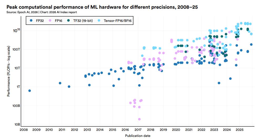 2008年至2025年间,机器学习硬件的峰值计算性能呈指数级增长,FP16、Tensor-FP16/BF16等低精度格式,已成为多数训练与推理场景的标准配置。