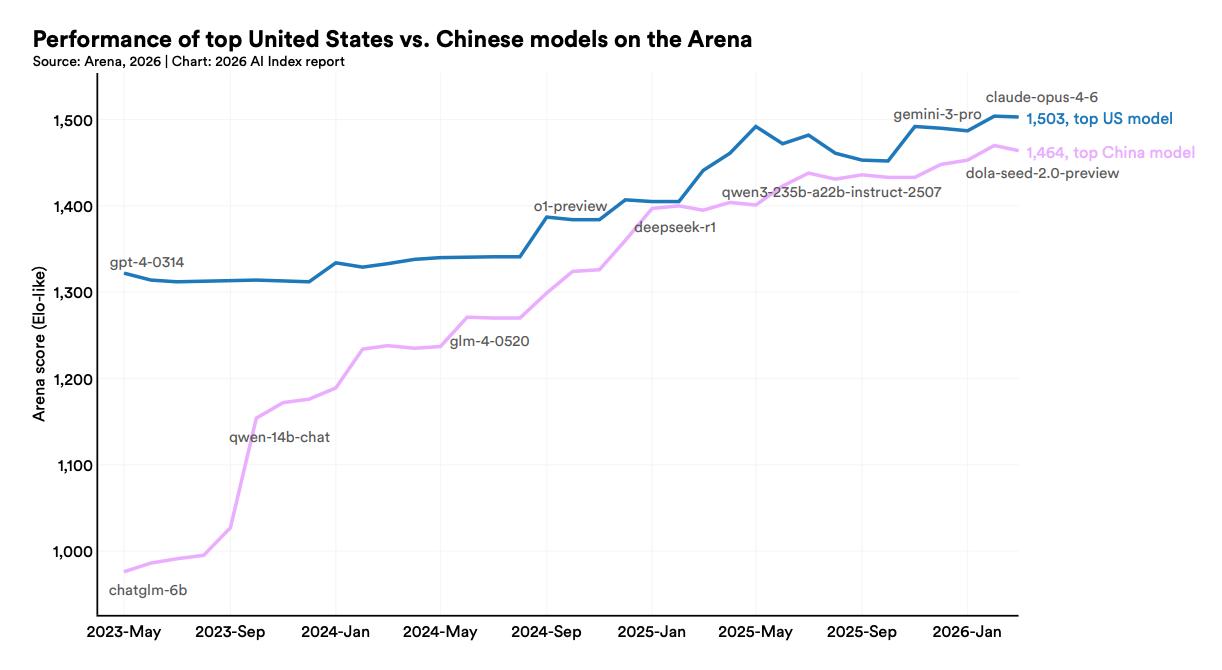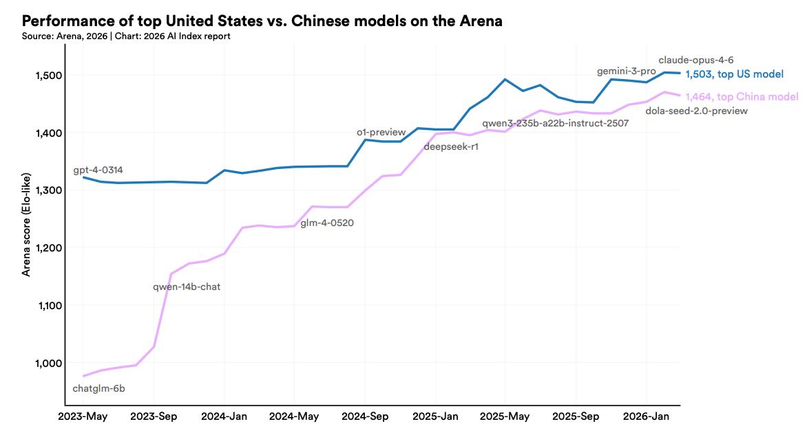 2025年2月,DeepSeek-R1仅以0.4%的差距落后于当时领先的美国模型o1-2024-12-17。截至2026年3月,美国Claude Opus 4.6领先字节的Dola-Seed-2.0 Preview,差距为2.7%。