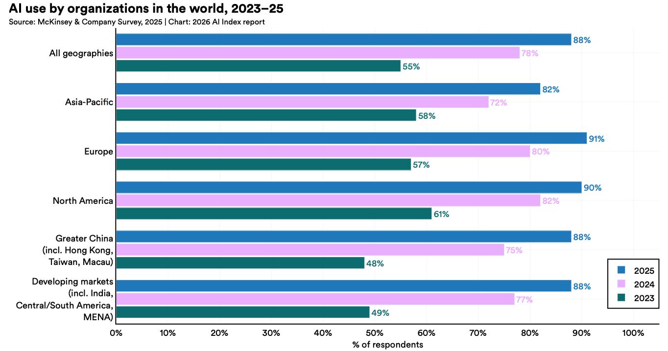 2025年,企业AI adoption率持续上升,受访组织中生成式AI已在70%的企业中用于至少一项业务职能,中国与欧洲同比增速最高。AI Agent在几乎所有业务职能中的部署率仍仅为个位数,处于早期阶段。