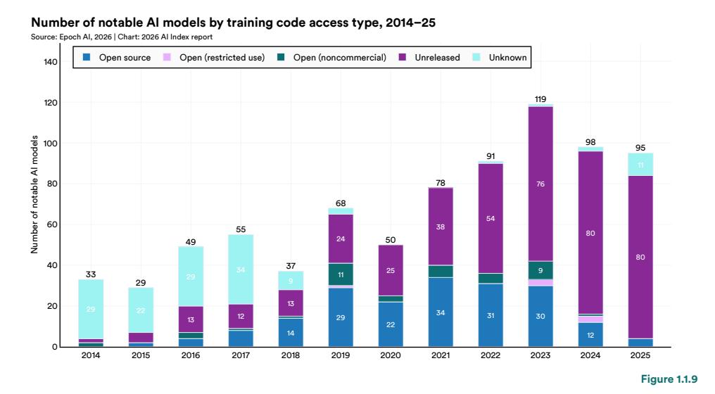 首先,重磅模型发布数量较上年有所减少,前沿AI系统愈发集中在极少数机构手中,但模型的训练代码、数据集规模、参数量等核心信息开源大幅减少。