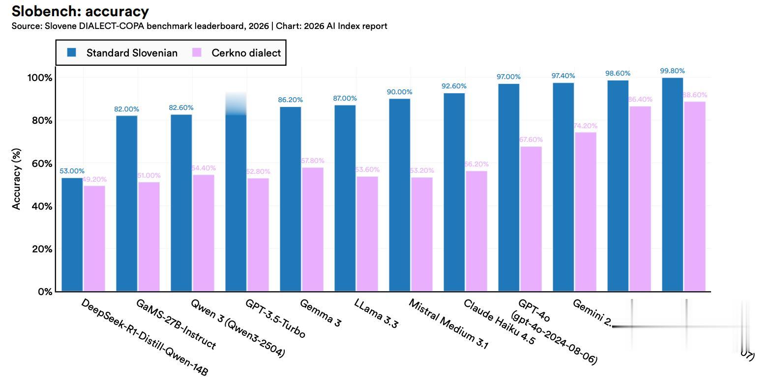在斯洛文尼亚常识推理测试中,多款顶尖模型用区域方言测试时,准确率较标准语版本下跌近50%。