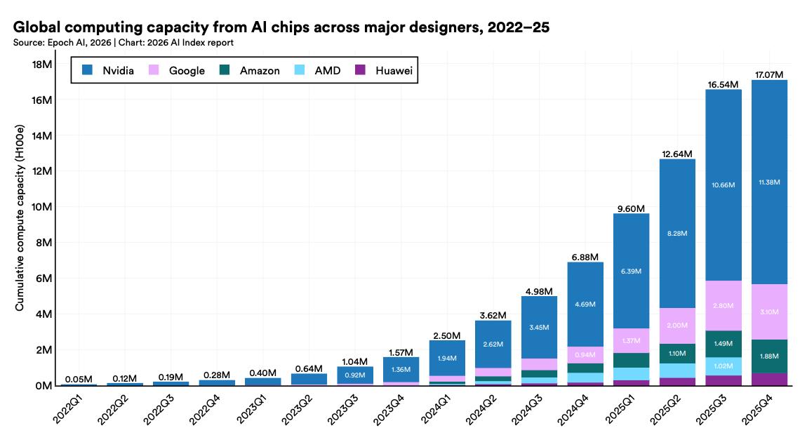 主流芯片厂商的AI算力供给持续扩张,自2022年起,总算力规模以每年约3.3倍的速度增长,达到约1710万块H100等效算力。