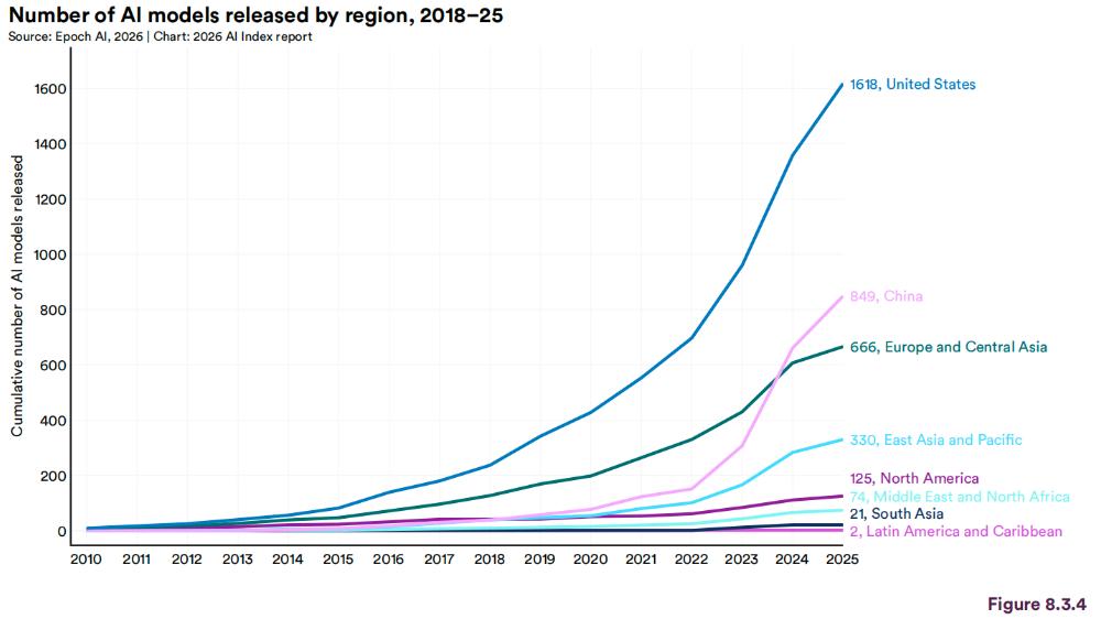 在AI模型开发数量方面,中国和美国依旧占主导地位。根据Epoch AI追踪公开报道的模型发布数据,2018年至2025年间,美国累计发布的模型数量从237个增长到1618个。中国在2022年至2025年间模型发布数量从151个增长到849个,增长超过五倍。由于开源生态的逐渐完善,越来越多的地区正在构建和部署自己的模型。