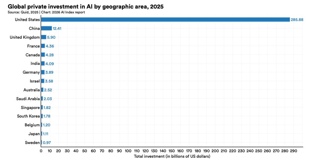 2025年的AI总投资额美国为近2859亿美元位居全球第一,中国124亿美元位居第二,英国59亿美元位居第三。在美国,超半数私募AI投资流向生成式AI,规模达1636亿美元;中国与欧洲的生成式AI投资合计为47亿美元。