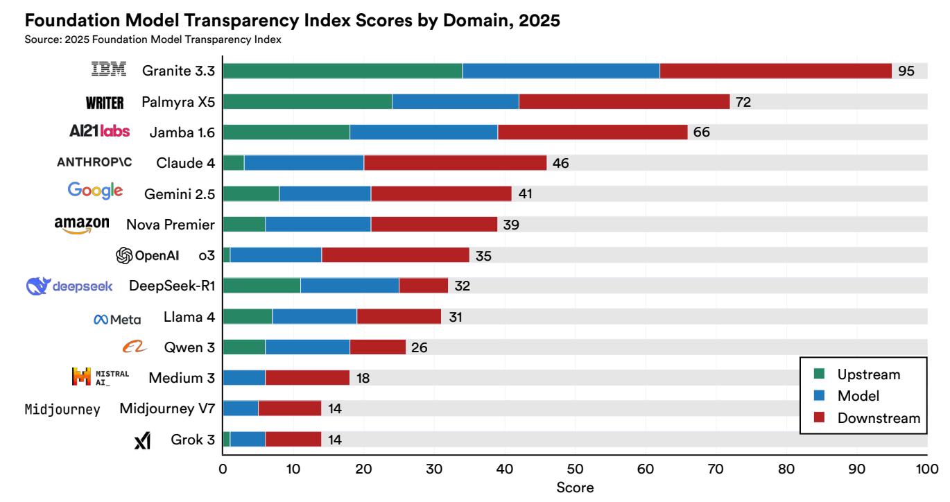 基础模型透明度指数(FMTI)在2023-2024年从37分升至58分后,2025年平均得分回落至40分。在训练数据、计算资源、部署后影响等核心维度,企业披露仍存在缺口。