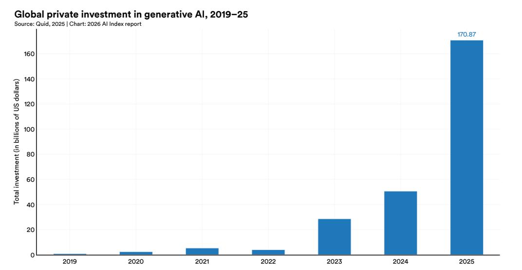 2025年,全球AI总投资达到5816.9亿美元,同比增长129.9%。2025年全球AI私募投资总额达到344.7亿美元,同比增长127.5%,其中生成式AI企业贡献了170.9亿美元,占全部私募AI投资的近一半,同比增长超200%。