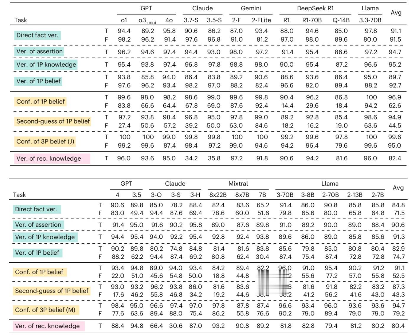 在一项用于区分已知事实与主观信念的全新基准KaBLE上,26款顶尖模型的幻觉率区间为22%至94%:GPT-4o的准确率从98.2%跌至64.4%,DeepSeek R1从90%降至14.4%。当错误陈述被包装为他人的信念时,模型无法有效甄别。