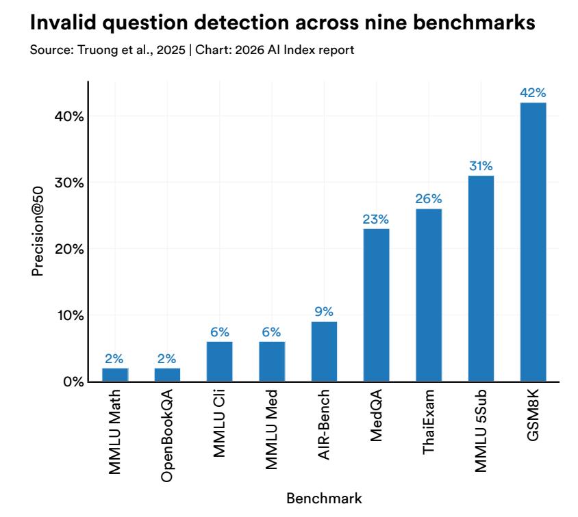 用于衡量AI进展的基准测试,正面临越来越严重的可靠性与刷榜问题。9个主流基准中,无效问题率从MMLU Math的2%到GSM8K的42%不等。