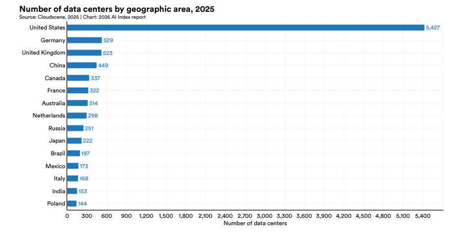一、AI论文、引用、专利数中国第一,美国运营5427个数据中心、中国449个 2025年整体来看,支撑AI发展的资源投入仍在持续增长,但其中有两大风险。