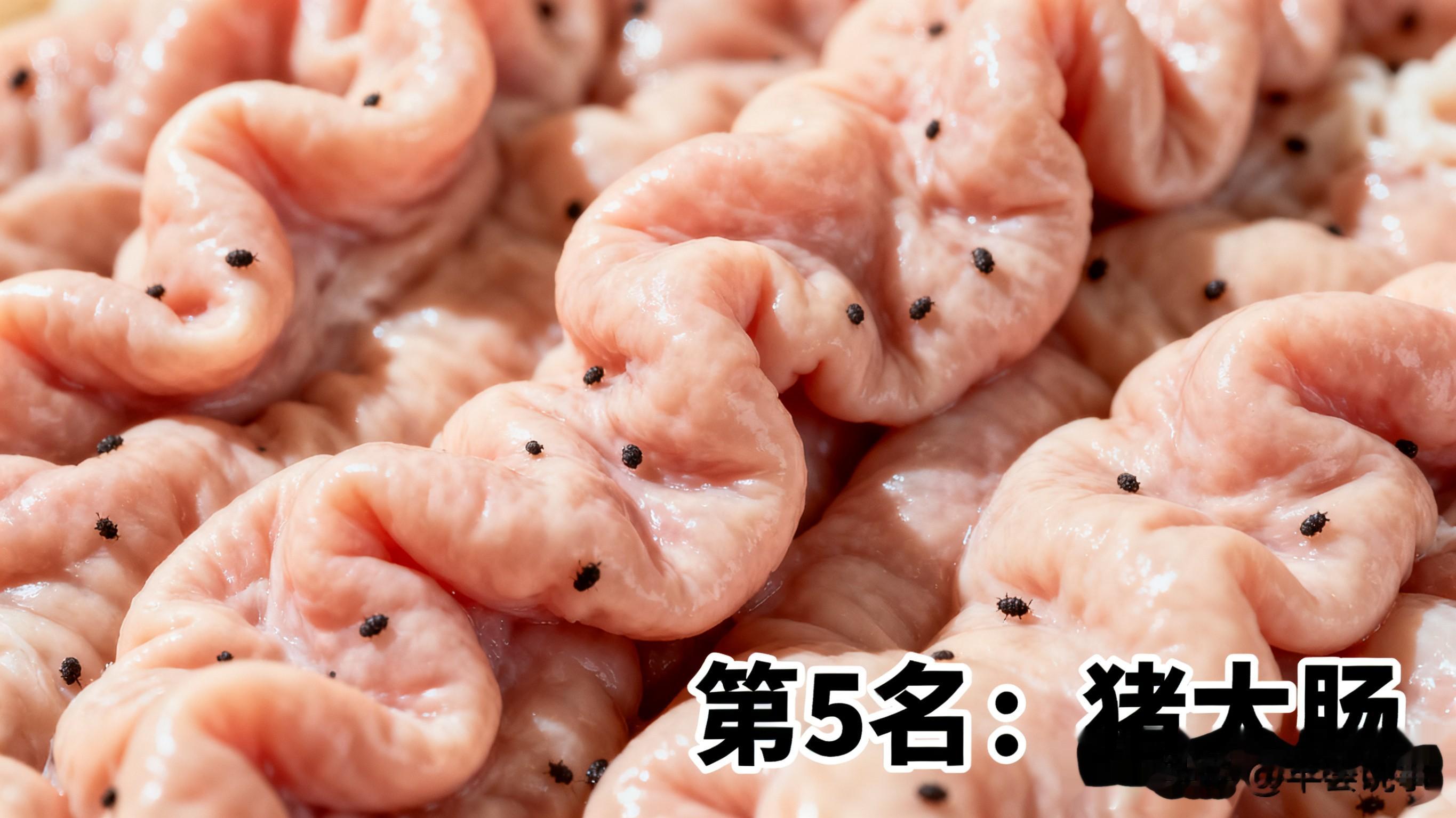 5. 猪大肠:猪大肠负责粪便排出,表面布满细菌和寄生虫卵,即使反复清洗,也难除干净。虽然红烧大肠、卤大肠味道香浓,但吃多了容易引发肠胃感染,出现腹痛腹泻,而且脂肪含量超标,还会增加肥胖风险。