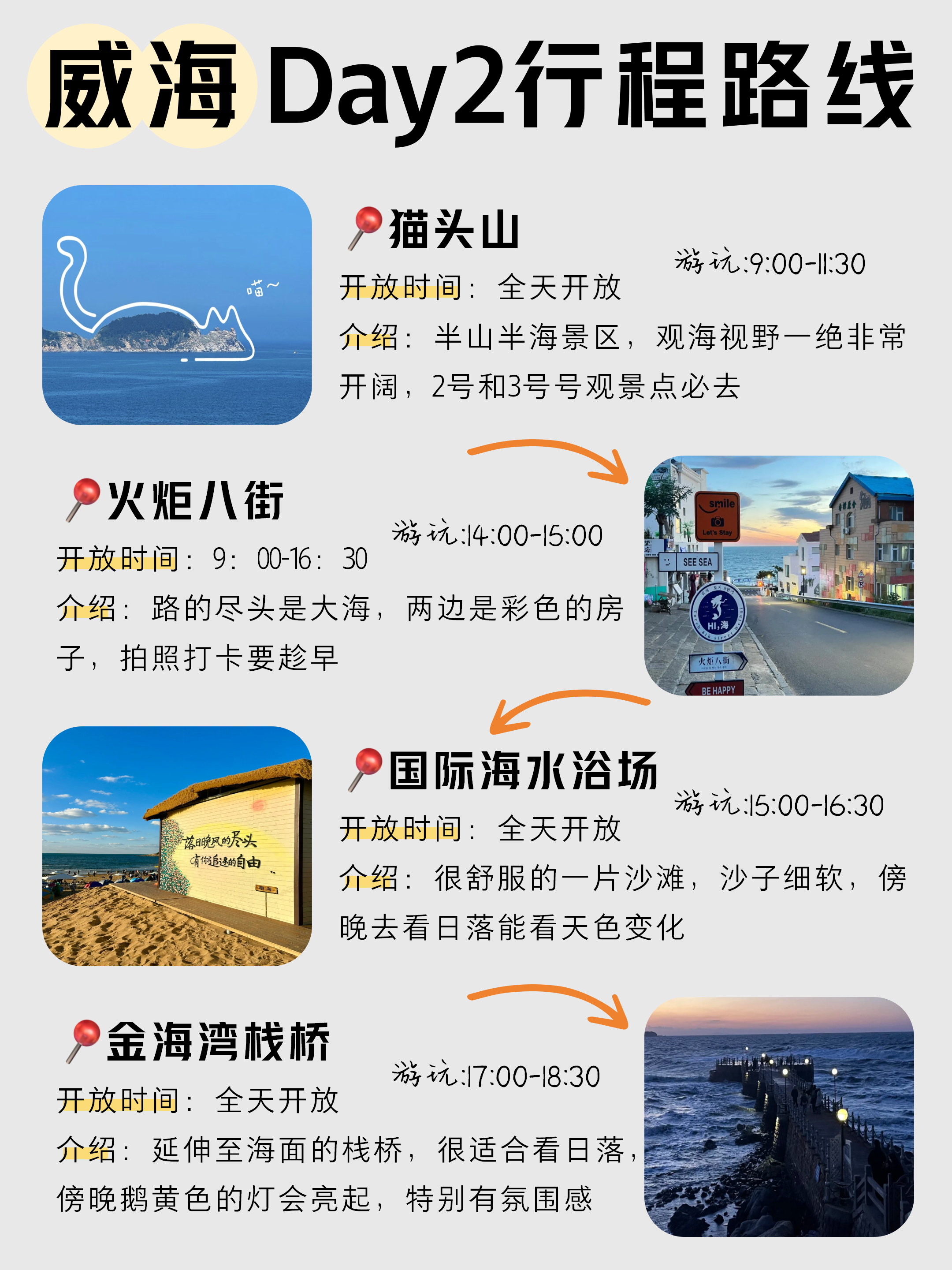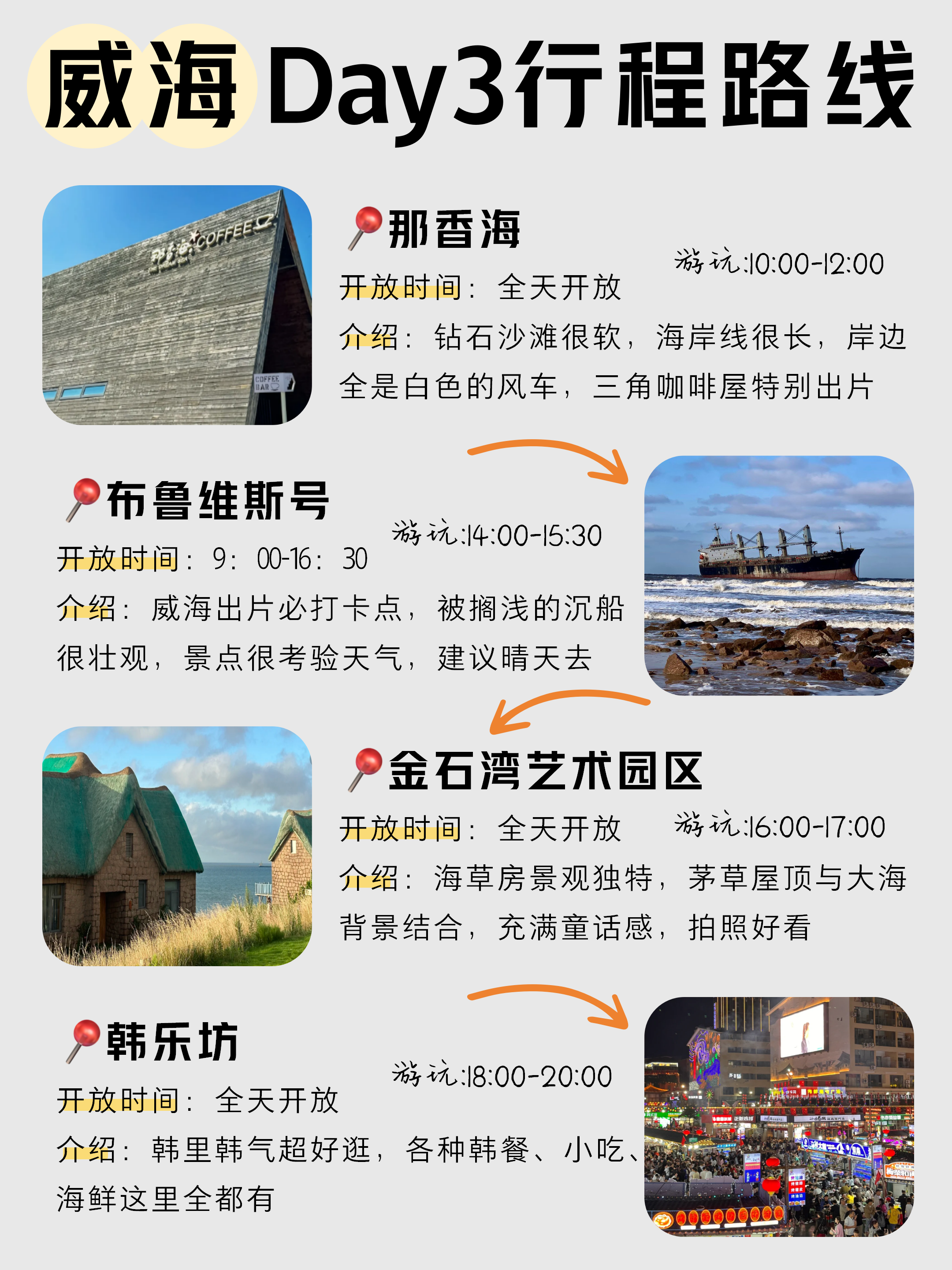 初次来威海的姐妹们住在韩乐坊附近✅靠近威海站,坐车方便,酒店🏨选择多,而且下楼就是夜市,住宿性价比高-威海美食很多,韩餐可以去韩乐坊随便吃,这里韩餐特别全,海鲜推荐去巧克力渔家,海鲜现捞现做的,蒸汽海鲜锅是招牌必点的,海肠贝丁捞饭海肠脆脆的,海鲜疙瘩汤料非常足,鲅鱼水饺皮薄馅大3-4月准备来威海旅游的姐妹一定要看好天气情况再出发,不要乱带衣服