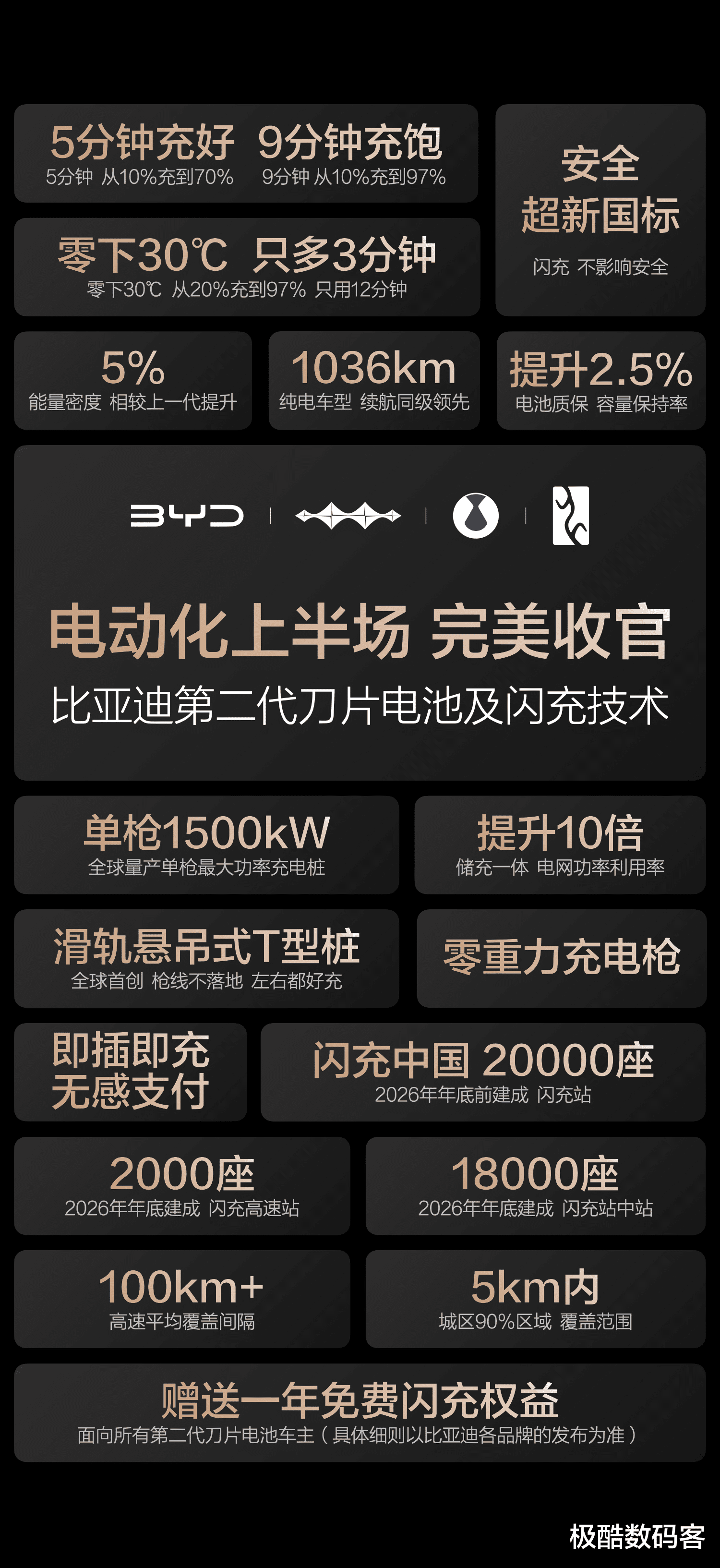 2026年3月5日,比亚迪第二代刀片电池正式发布,硬核闪充技术树立行业新标杆——5分钟补能70%,9分钟充至97%(从10%开始),单枪1500kW的充电功率,直接刷新全球量产车充电速度纪录。
