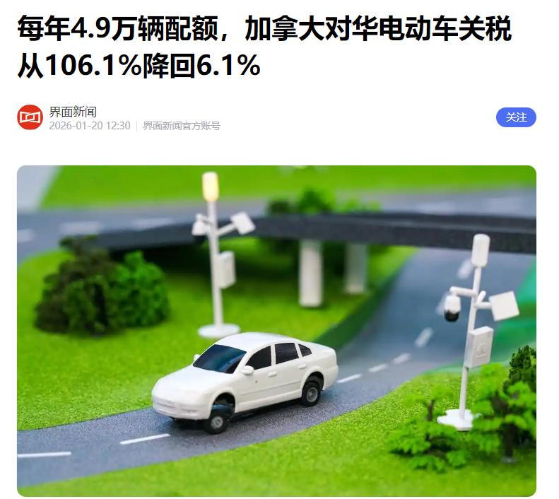 信息来源:每年4.9万辆配额,加拿大对华电动车关税从106.1%降回6.1%