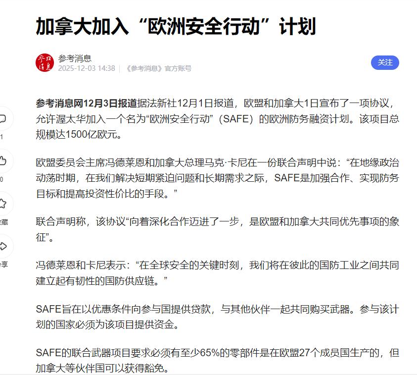 除了对华合作,卡尼还早有布局,去年12月就带着加拿大加入了欧盟1500亿欧元的“欧洲安全行动”防务计划。
