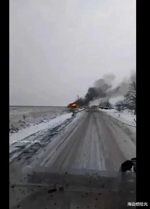 图来自俄罗斯记者行车记录仪拍摄的视频,在俄军从后方向前线运送兵源和物资的主要道路上,随处可见被乌克兰无人机摧毁的装备,很多军人无车可乘,步行上前线。