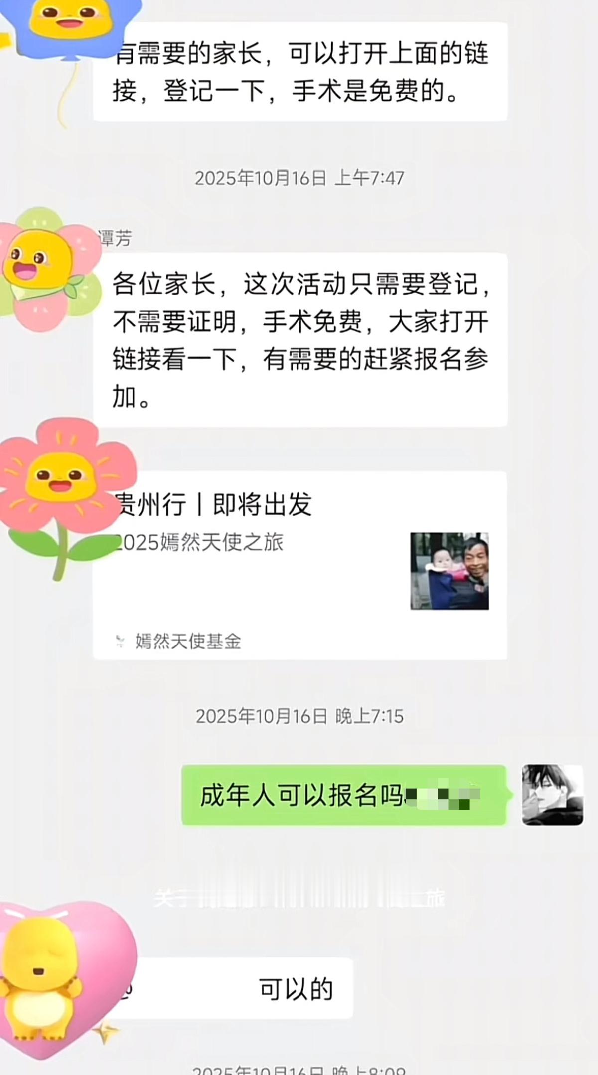 2025年,嫣然天使基金会到贵阳市口腔医院开展公益活动。小冉曾在该医院接受过治疗,并加入了患者群,有医生提醒他们可以申请嫣然天使基金的帮助。