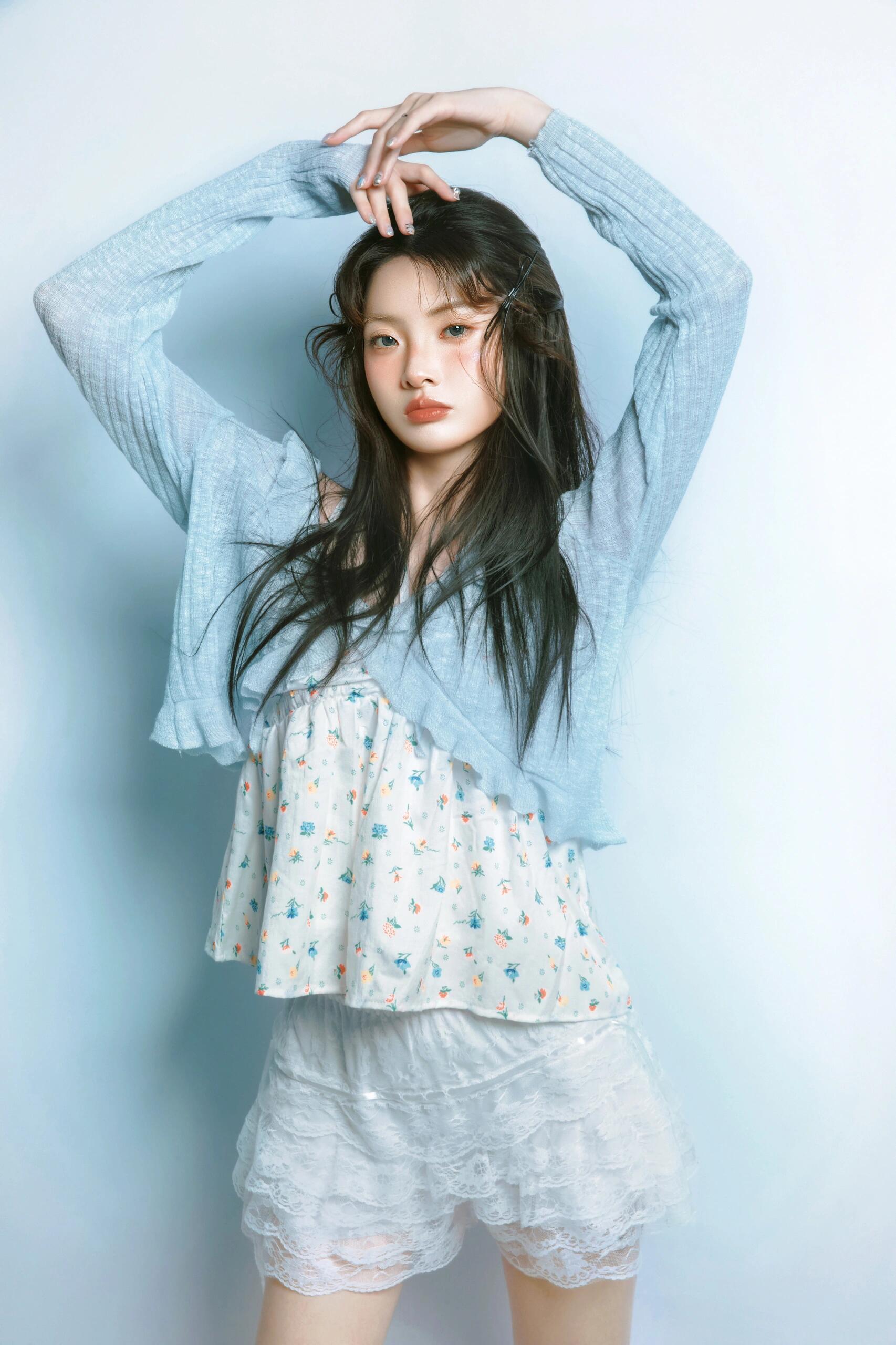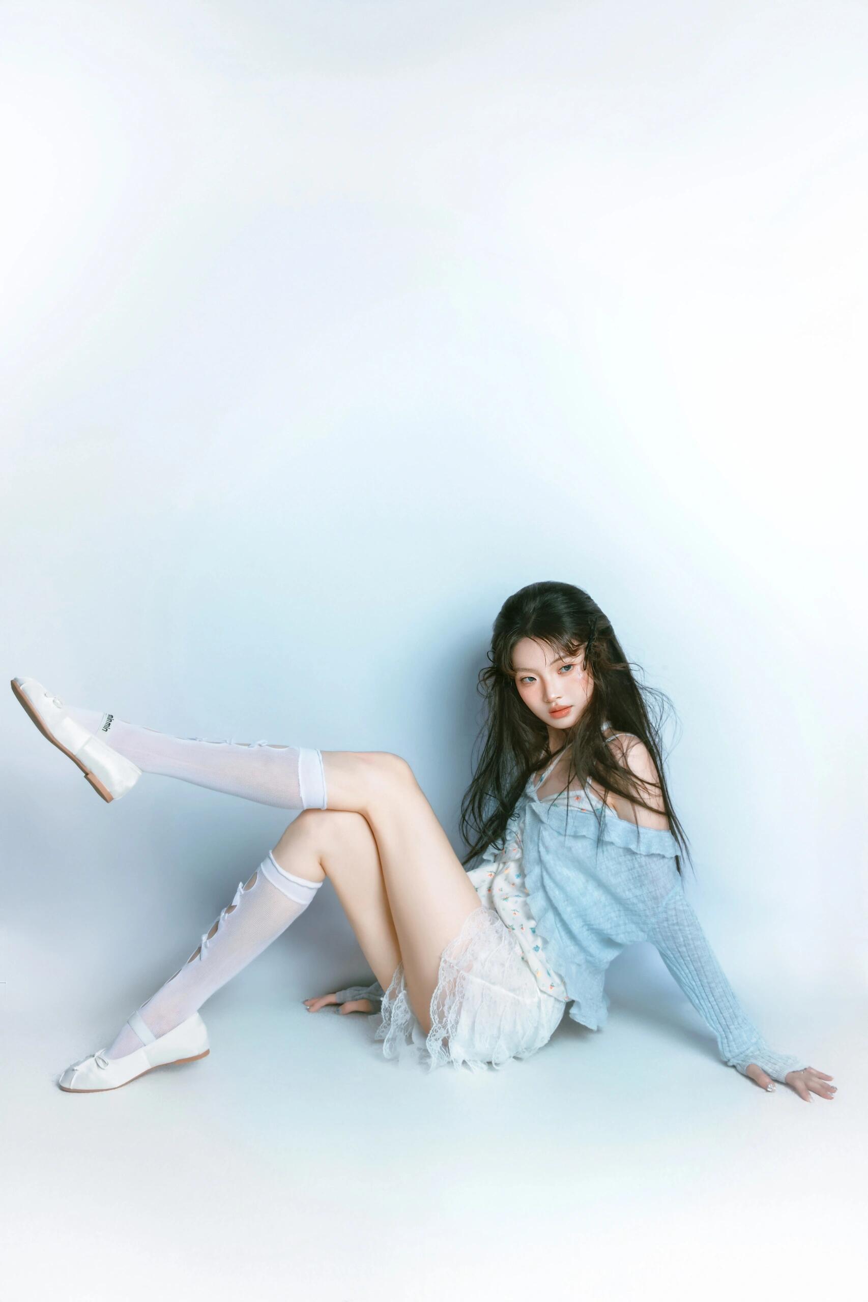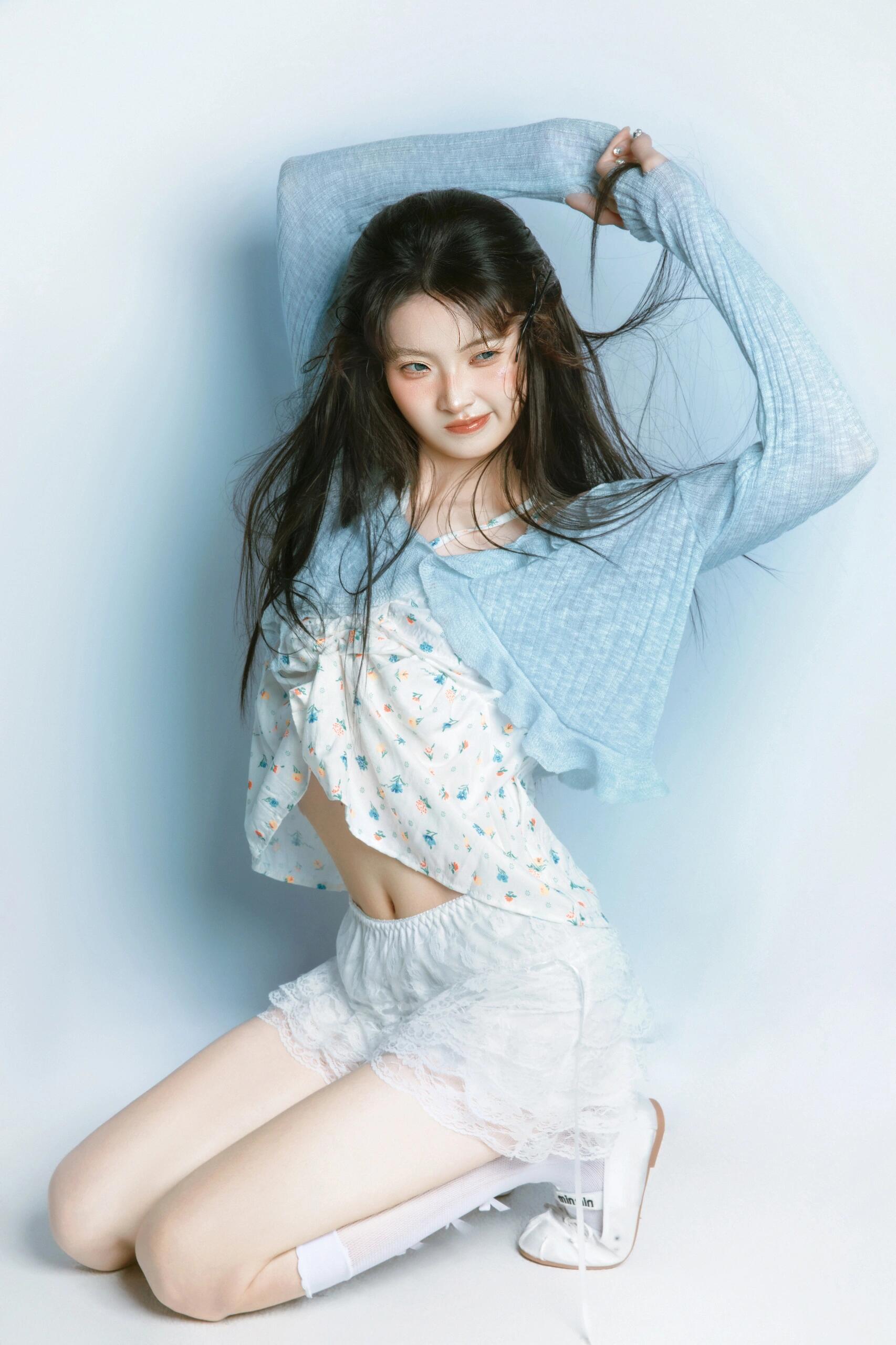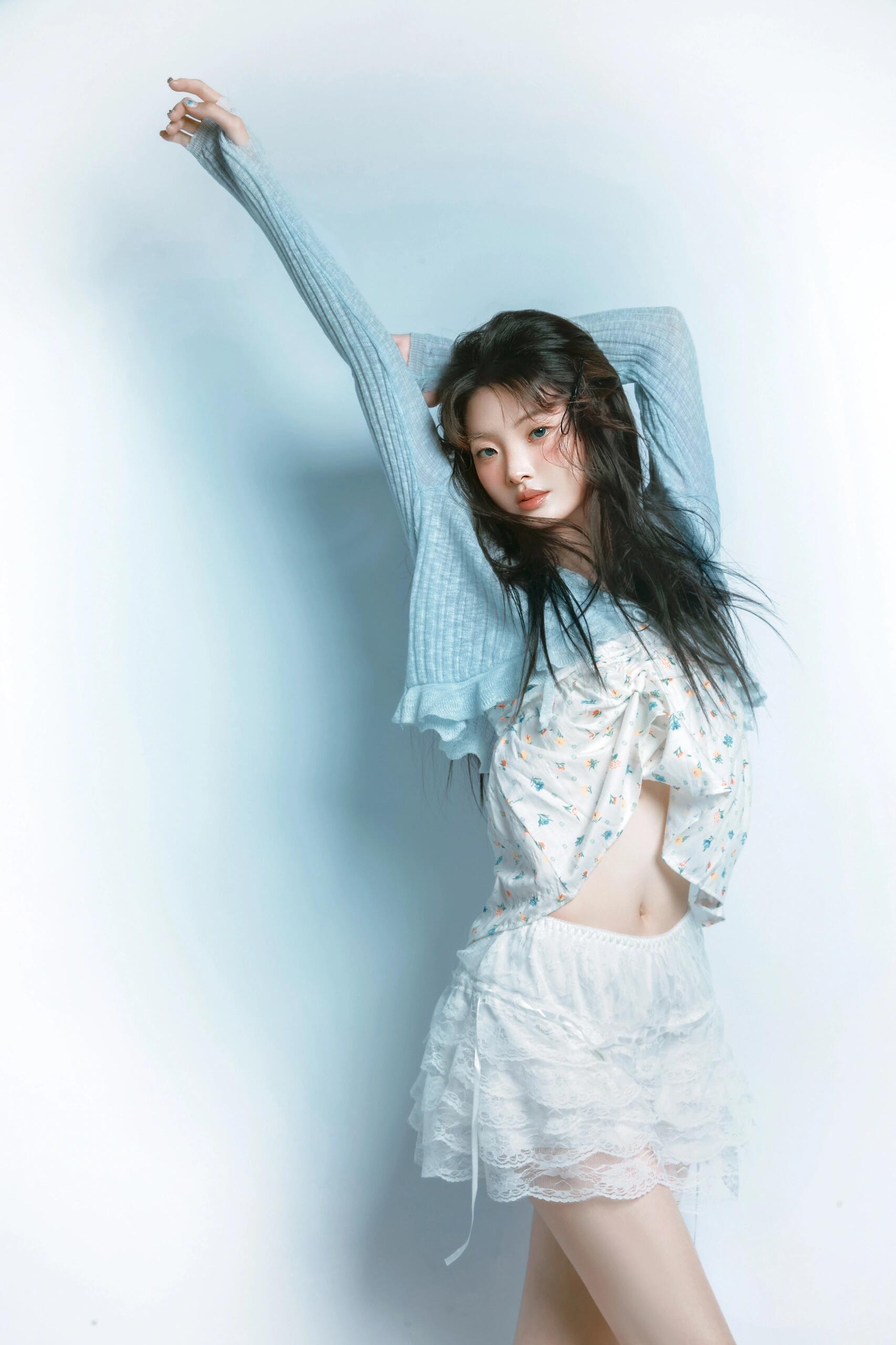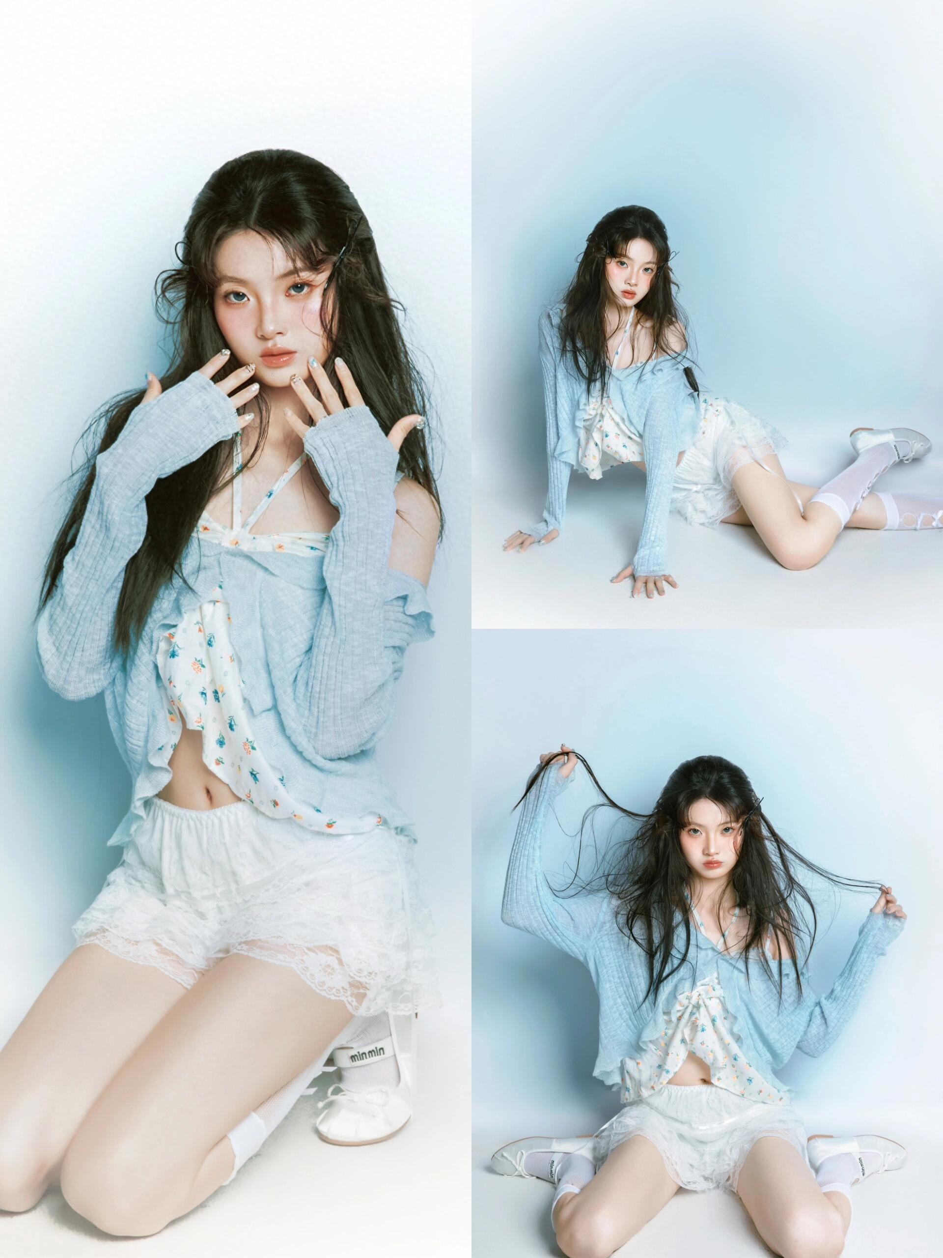 这组作品里,模特微乱的发丝、随性的发夹就是“慵懒感”的情绪锚点;偶尔露出的腰线、带点张力的肢体动作,是“小性感”的情绪锚点;而整体的清新色调又包裹着“少女感”的情绪锚点。这些锚点让青白配色不再是平面的色彩组合,而是立体的情绪载体,观者能从画面中读到“慵懒的午后少女”“有点小叛逆的甜妹”等具体形象,而非抽象的“清新”二字。