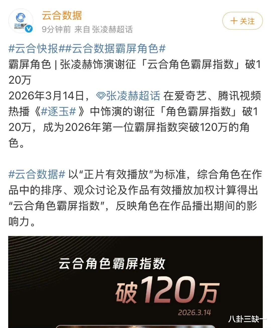 张凌赫饰演的谢征霸屏指数破120万,田曦薇樊长玉破50万,包揽酷云角色周榜前六。
