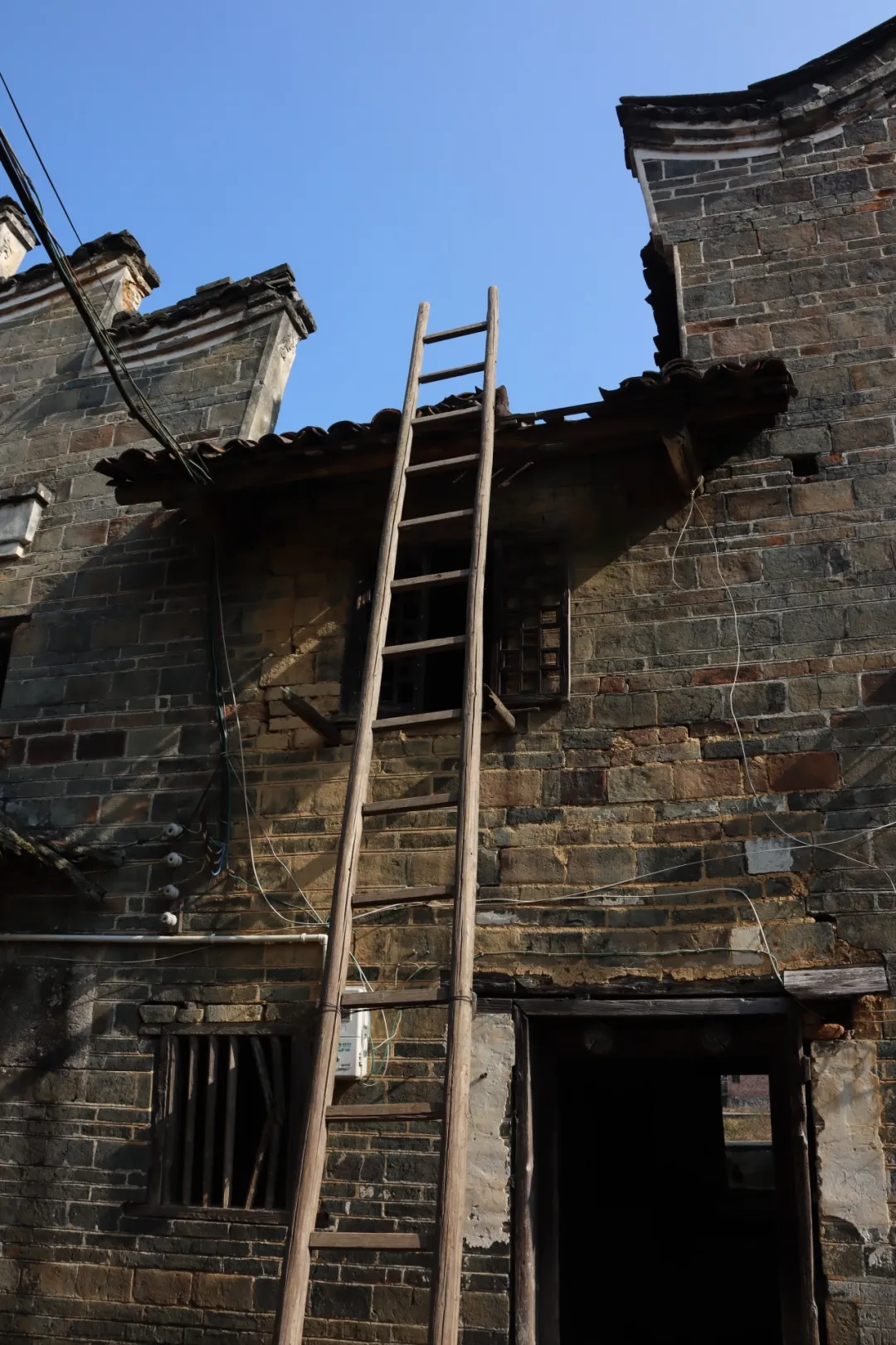 从祠堂侧边小巷探出头,走了两步看到了一个木板搭建的棚子,在湘南地区湿热多雨的气候下,木板外侧长满青苔,厚厚一层,阳光下看起来毛茸茸的。棚下露出梯子的一端,另一端搭上了屋檐上,原来是趁着好天气,村民打算修缮一下祠堂的屋顶。“屋顶基本年年都要修,瓦壁换了要换新的。”