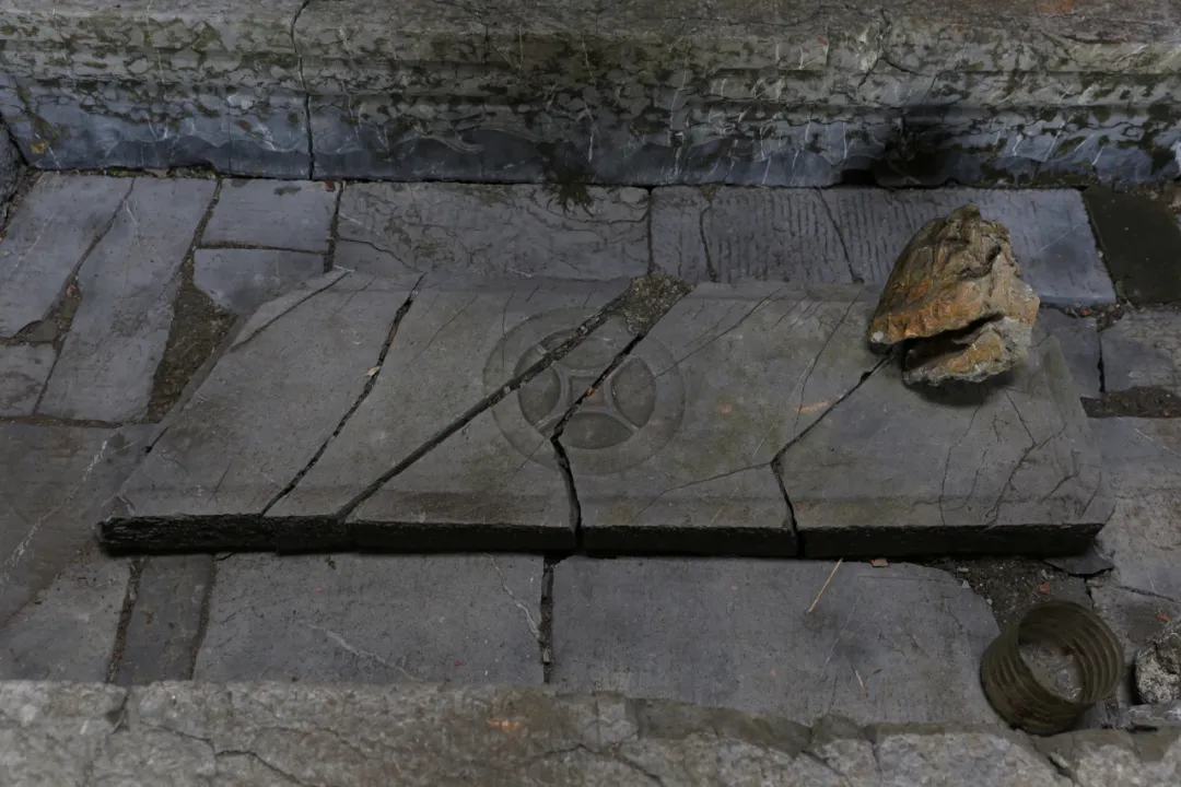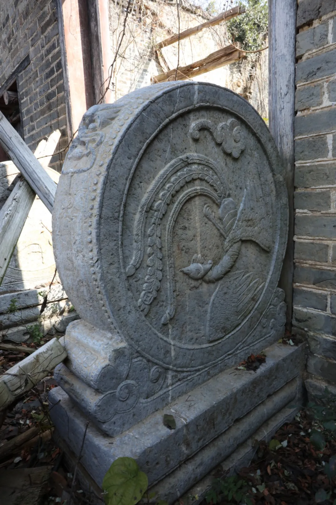 在青石板路和乡间土路的切换中,又绕回了通车的水泥路段,到了新屋群落外围,被一对大石鼓吸引。石鼓静立于杂草残梁中,两面依稀可辨龙、凤、鹿、云、梅花等图案,神韵犹在,栩栩如生。